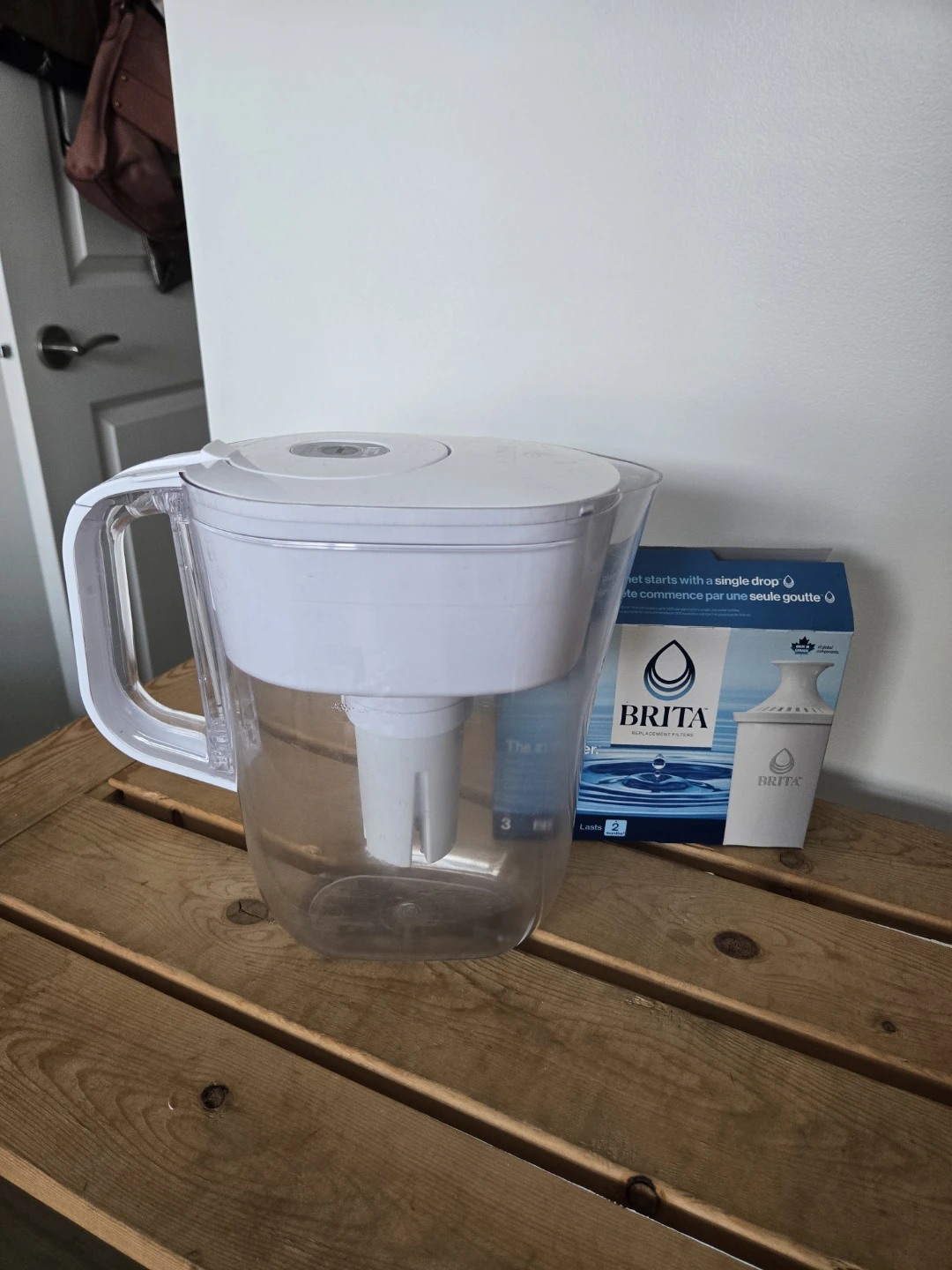 Brita water filter pitcher with one filter in it (used a few times only) and two replacements included. It's white and clear plastic. This pitcher helps reduce contaminants in your drinking water.