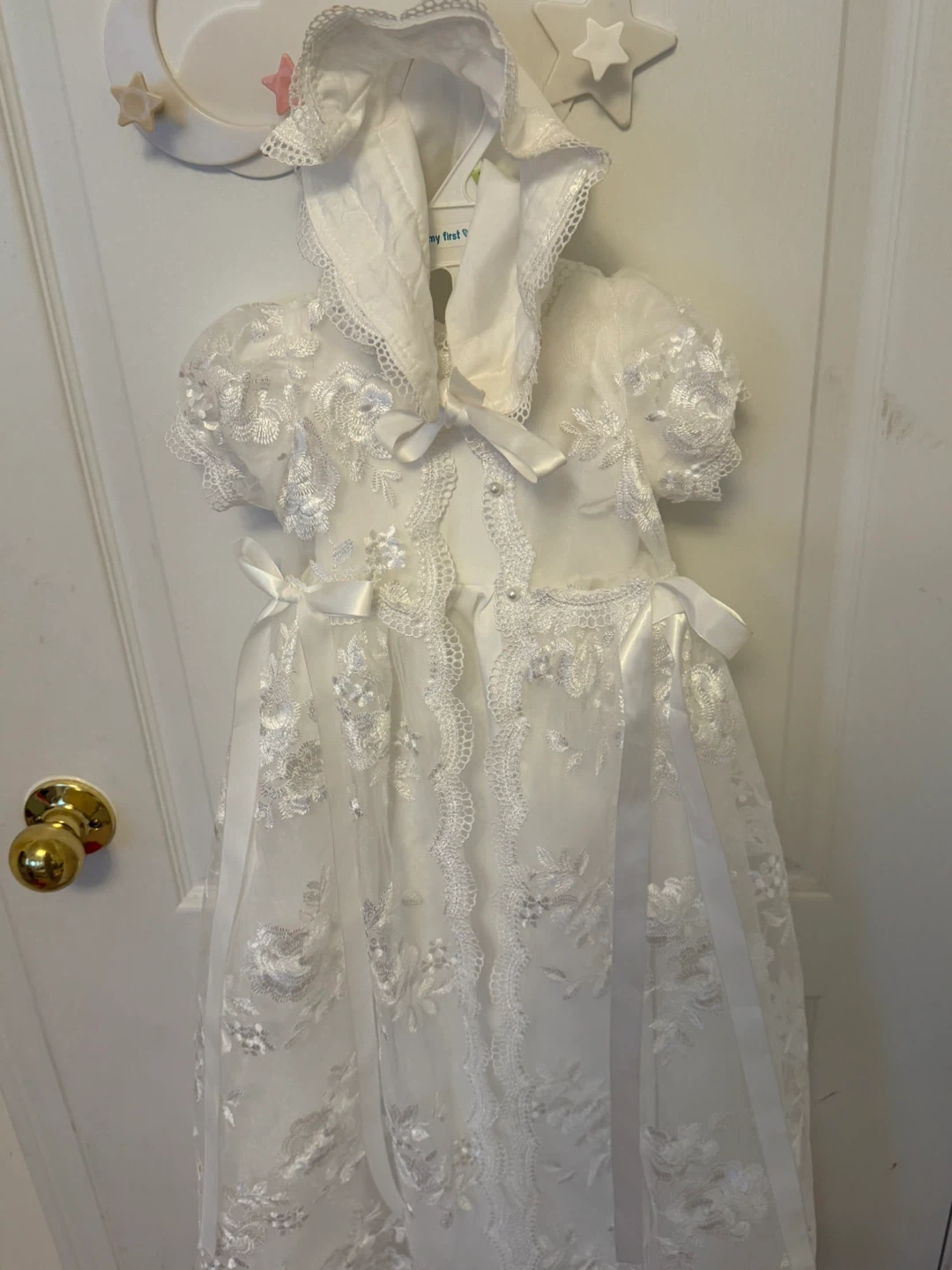 Selling a beautiful white lace christening gown from My First Gown. This delicate dress is perfect for a special occasion like a christening or baptism. It features intricate lace detailing and a sweet, classic design. In great condition!