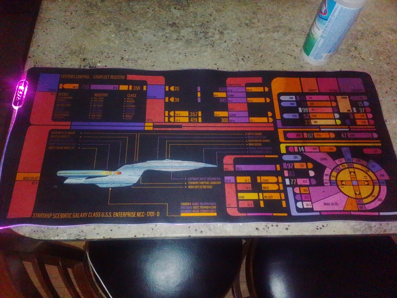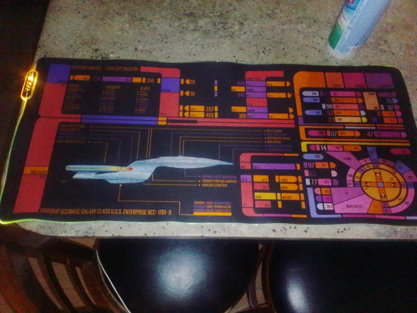 Selling a Star Trek themed mousepad featuring the U.S.S. Enterprise NCC-1701-D. It has a schematic galaxy class design and LED lighting around the edges. Perfect for any Star Trek fan's desk!