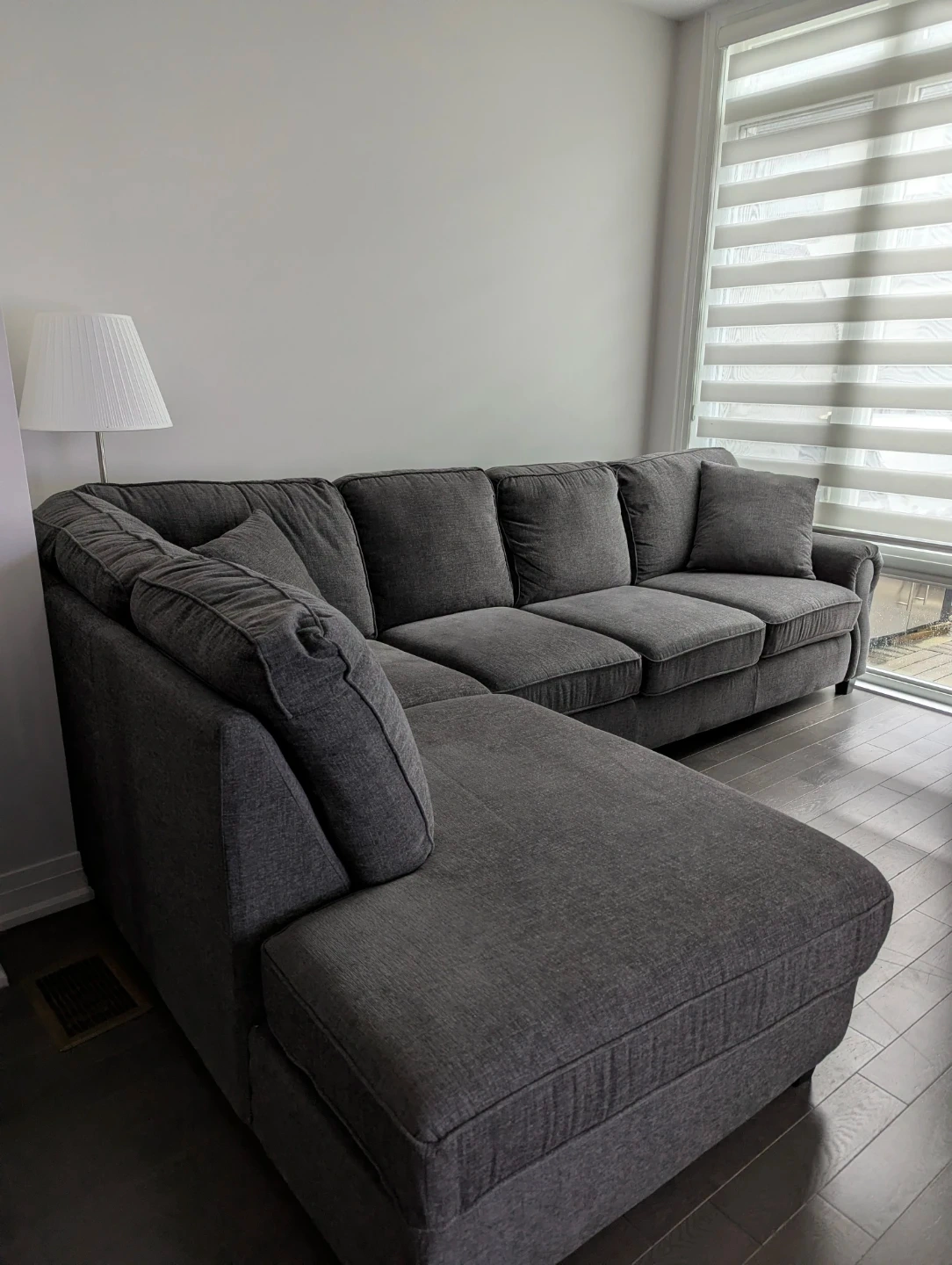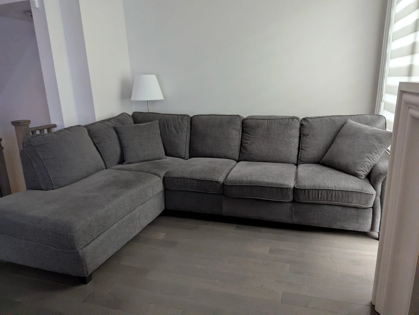 This is a large couch / 2-Piece Sectional Sofa with a left-facing chaise in a stylish grey colour, purchased at Leons Furniture