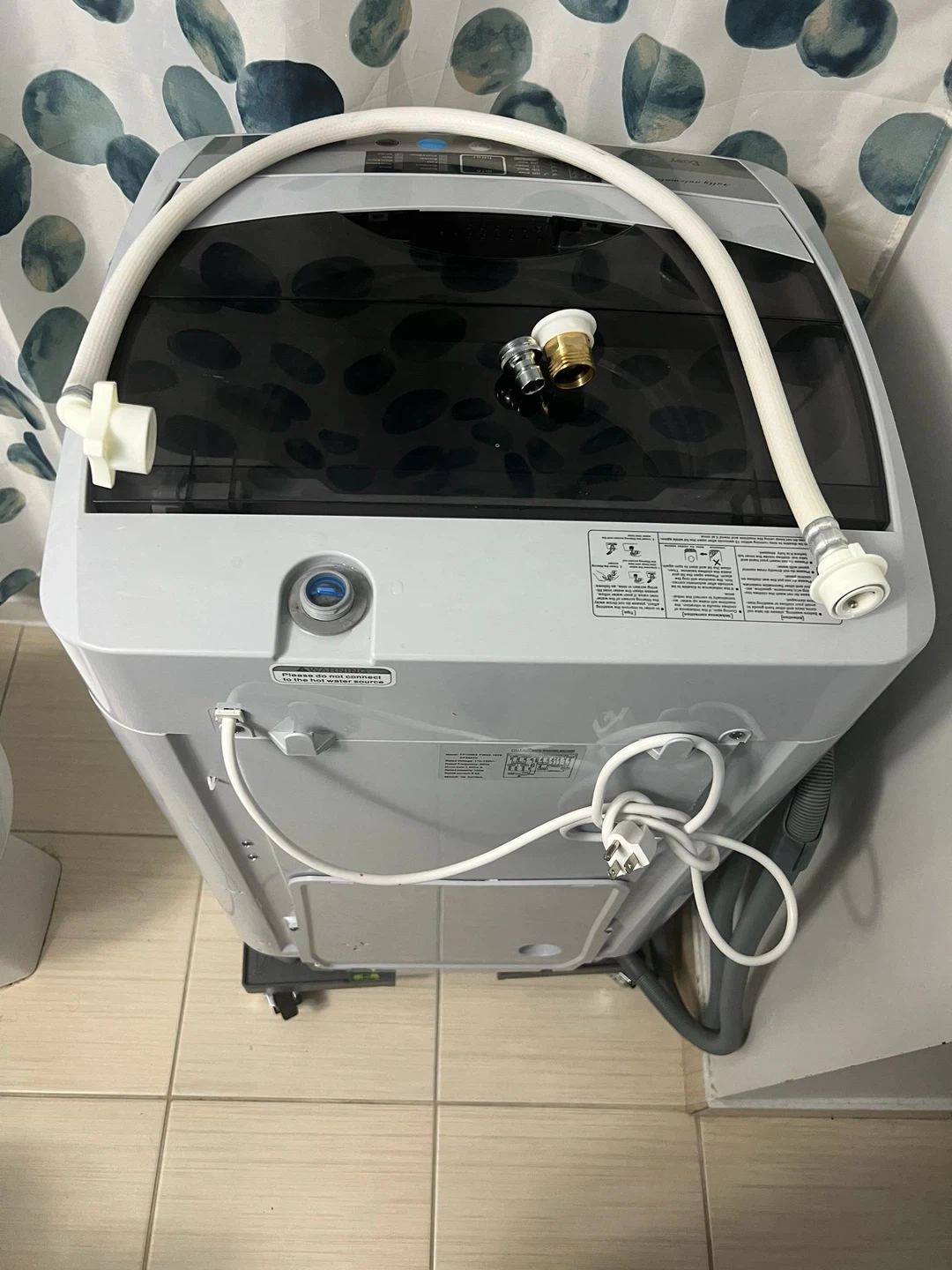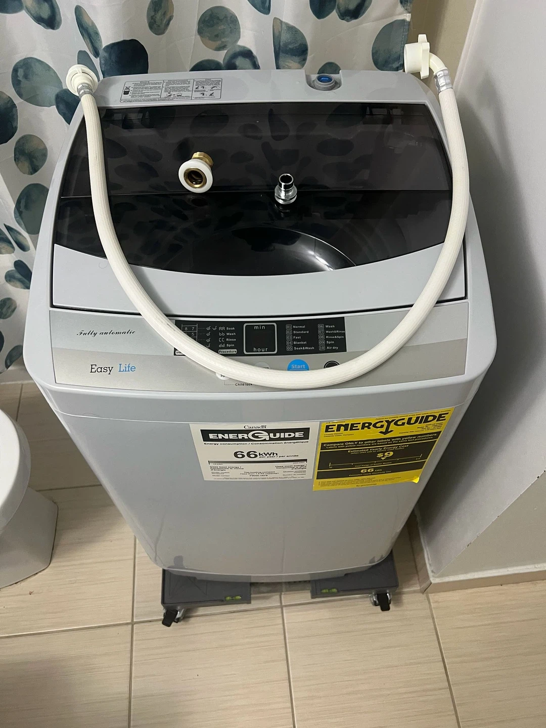 This is an Easy Life fully automatic top load washing machine. It comes with inlet hoses and connectors. It's great for small spaces and efficient laundry needs!
