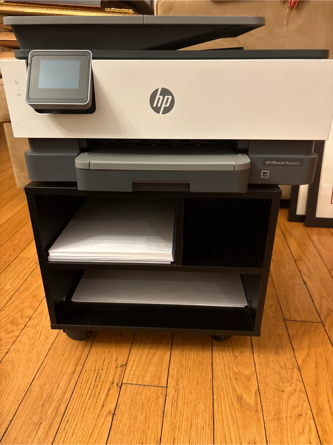 HP OfficeJet Pro 8025 all-in-one printer. It's a wireless printer, scanner, copier, and fax machine. Includes paper tray with paper. It prints up to 20 pages per minute in black and 20 pages per minute in colour.