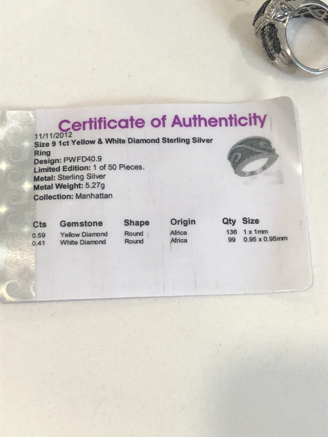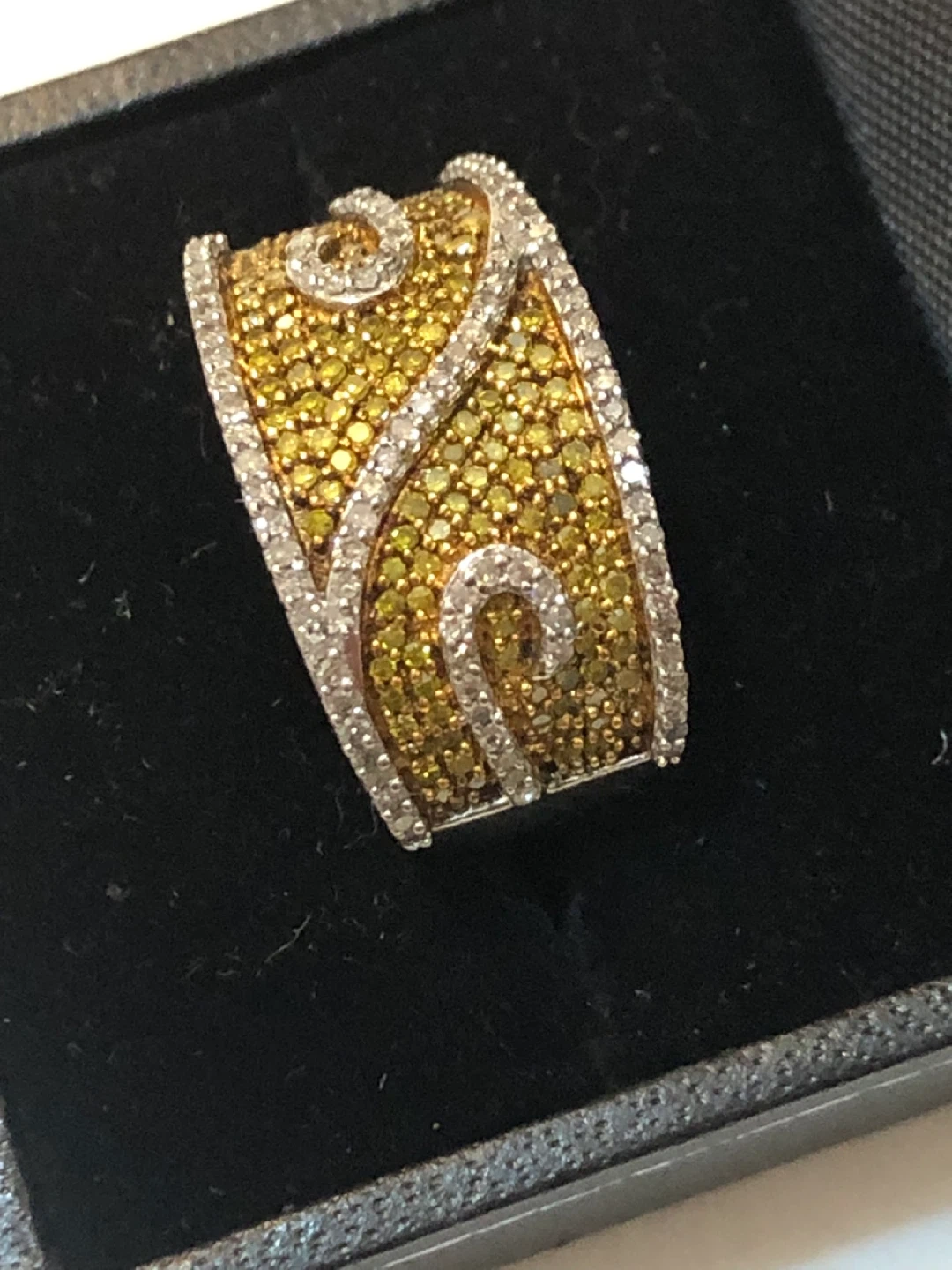 Selling a beautiful ring made of sterling silver, marked with '925'. It features a lovely design with yellow and white diamonds . It weighs approximately 5.57