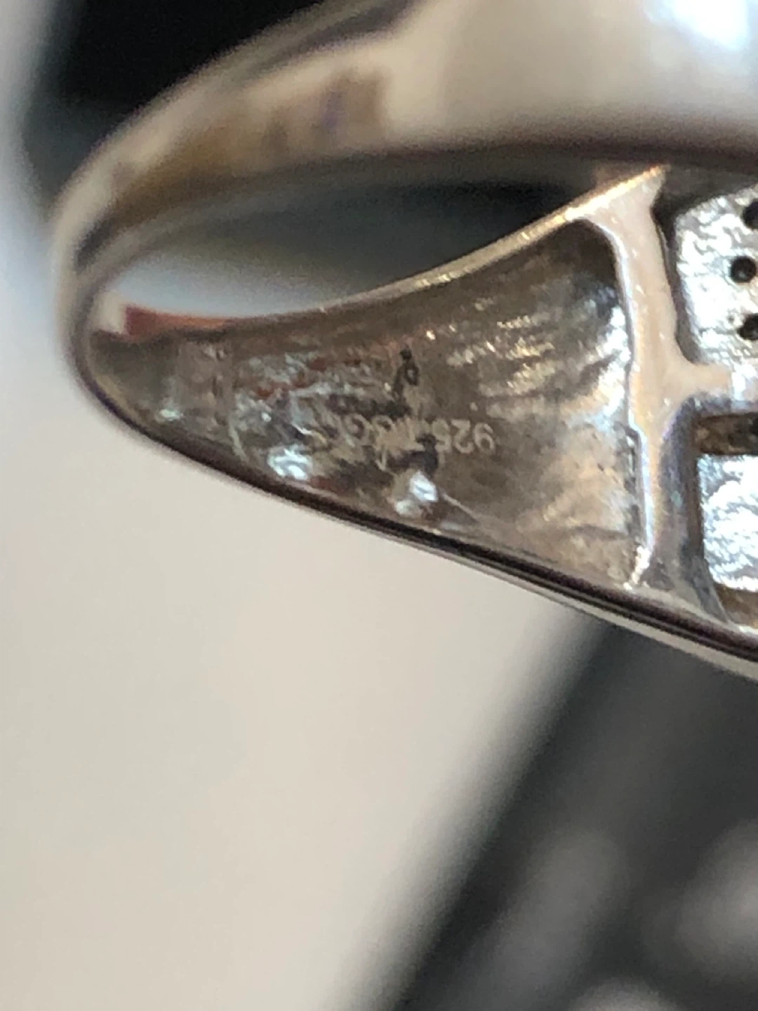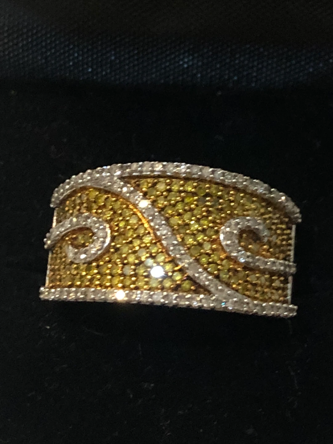 Selling a beautiful ring made of sterling silver, marked with '925'. It features a lovely design with yellow and white diamonds . It weighs approximately 5.57