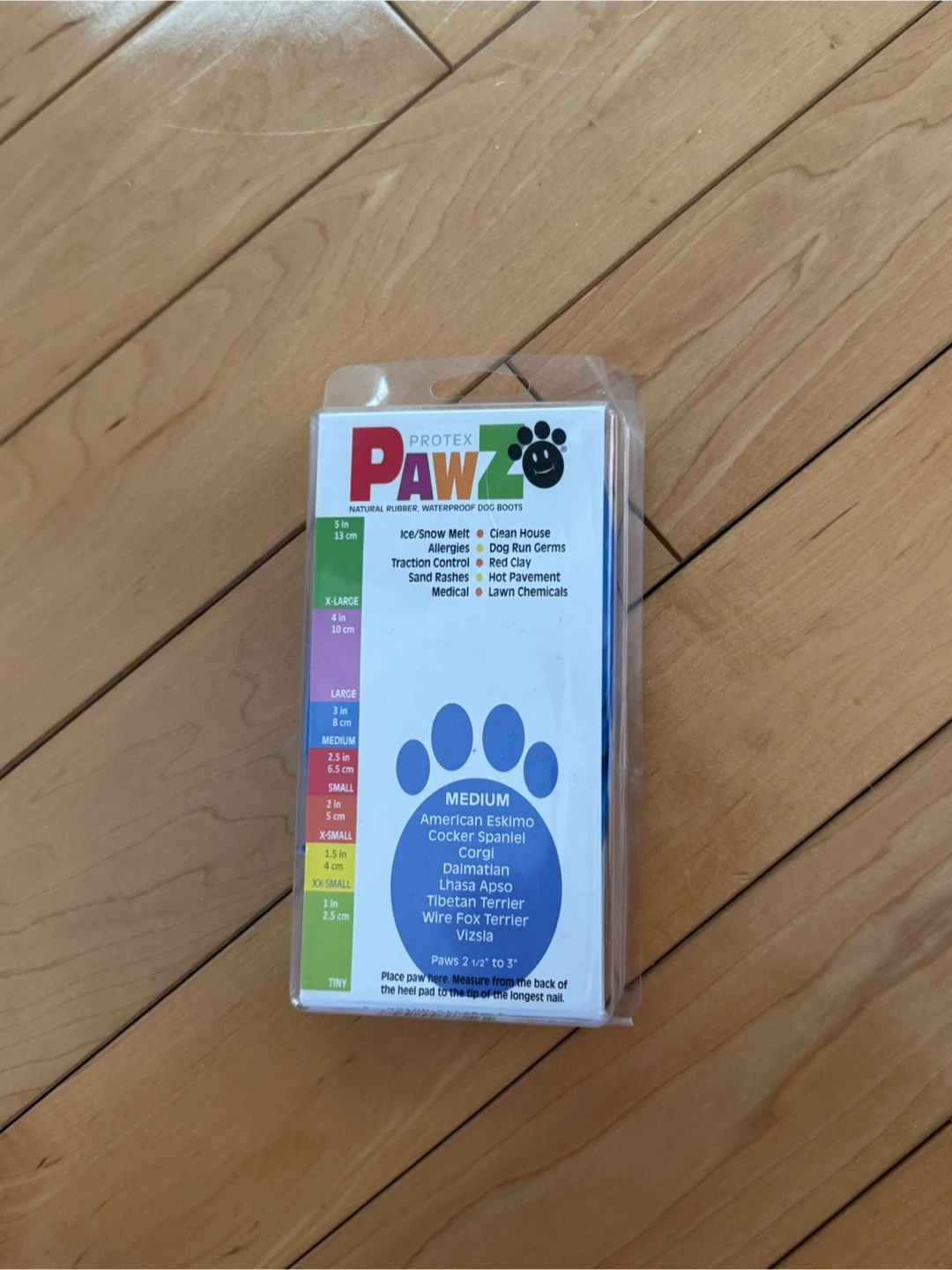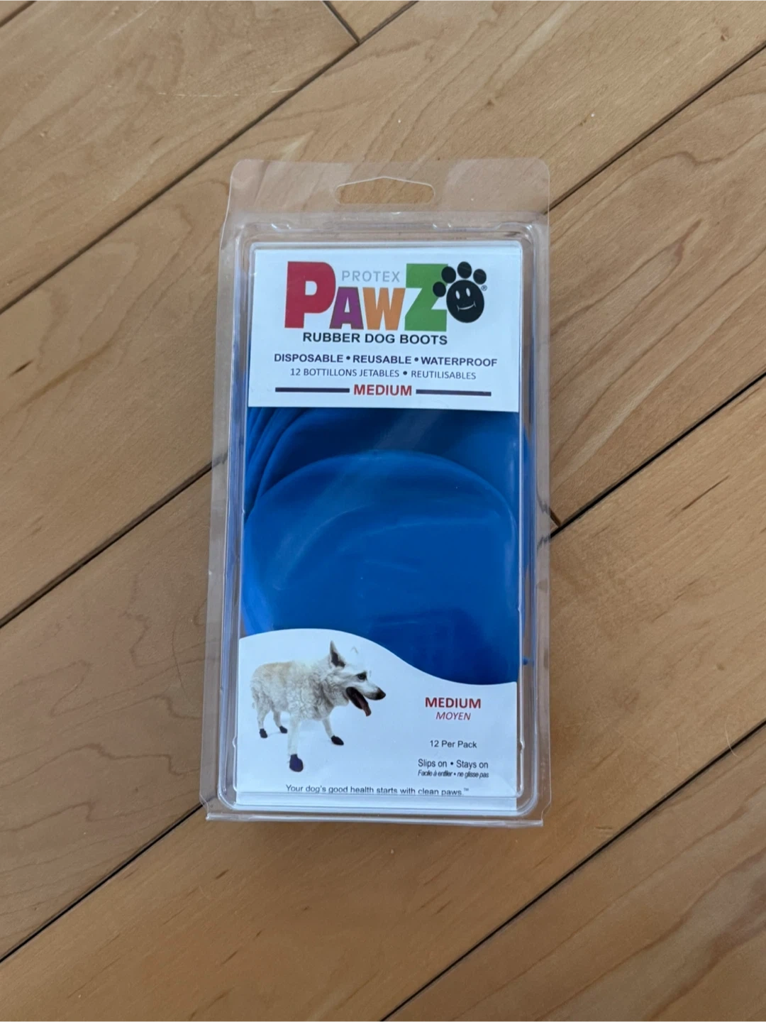 This is a 12-pack (opened with 11 new boots remaining) of disposable, reusable, and waterproof boots. They're designed for traction control and protection from ice, snow, salt, and chemicals. Paws 2 1/2" to 3" wide fit these medium-sized boots.