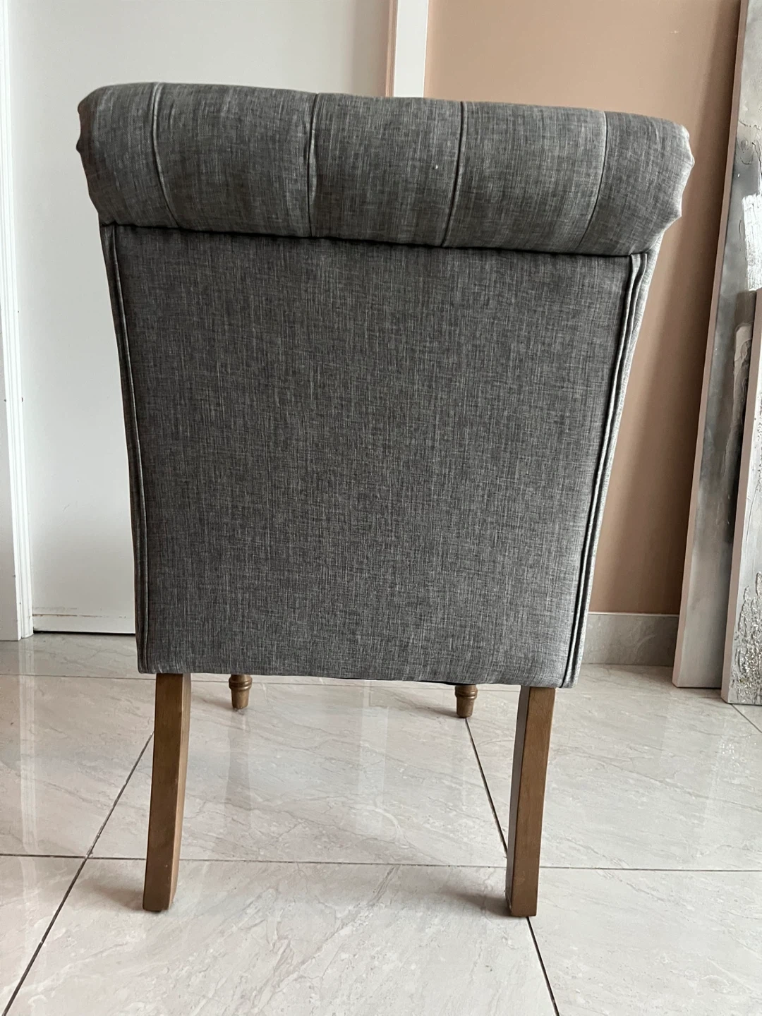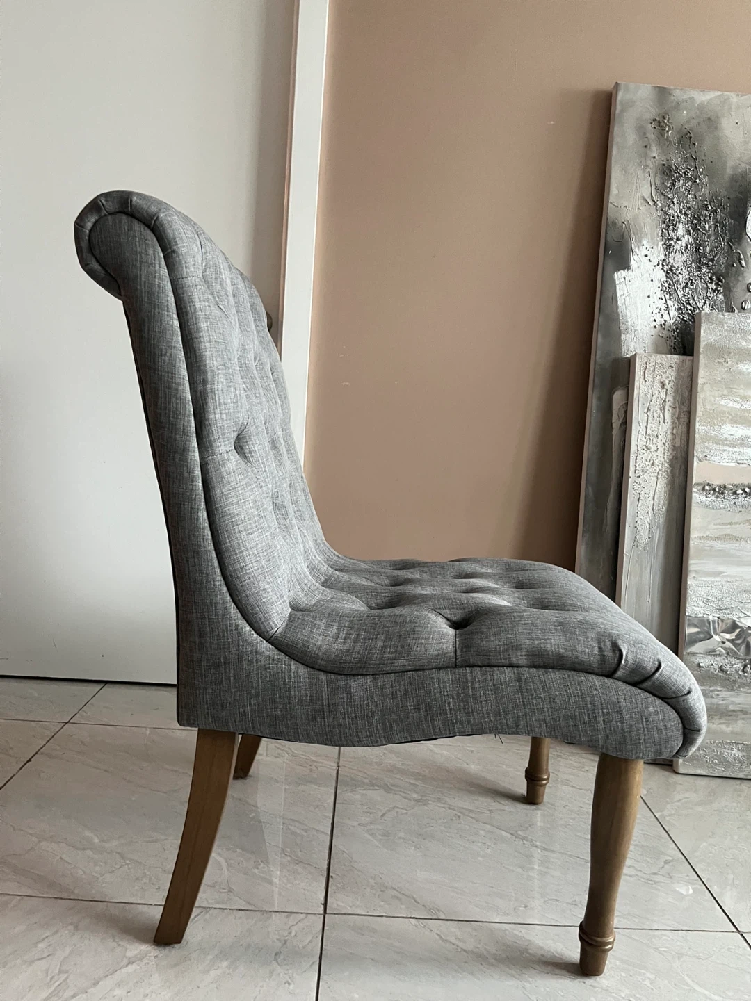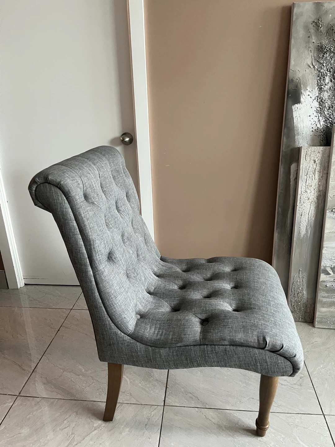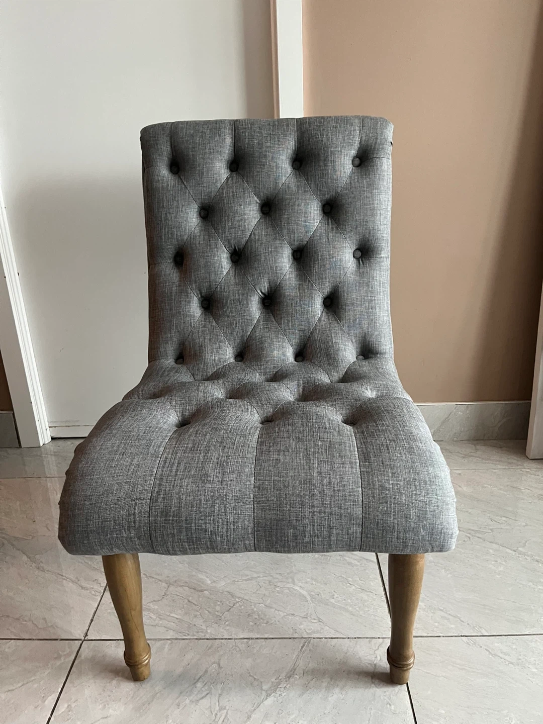 Selling TWO lovely and elegant, tufted accent chairs.The chairs feature a classic button-tufted design and a neutral grey fabric. This will add sophistication to any condo or home.