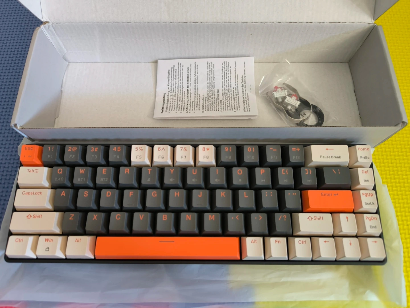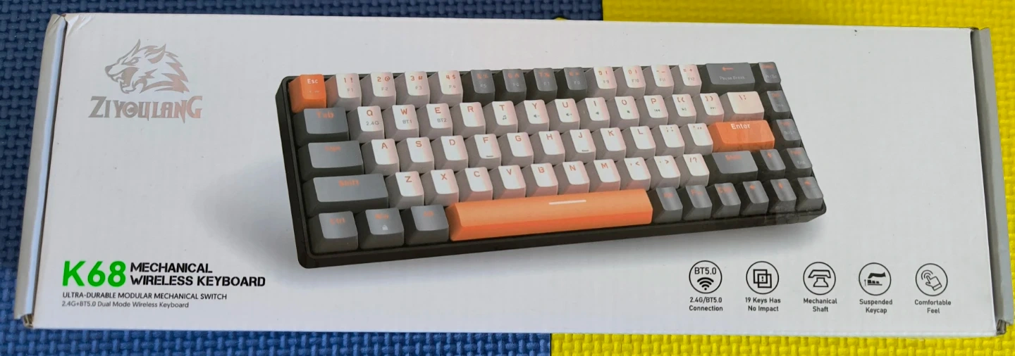 This is a Ziyoulang K68 mechanical wireless keyboard. It features 2.4G/Bluetooth connectivity and has a suspended keycap design for a comfortable feel. Uses 2 AAA batteries. Original box and accessories are included.
