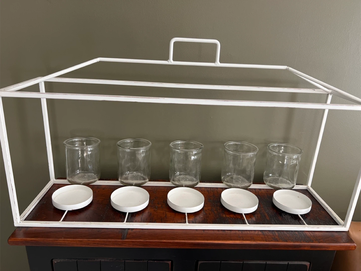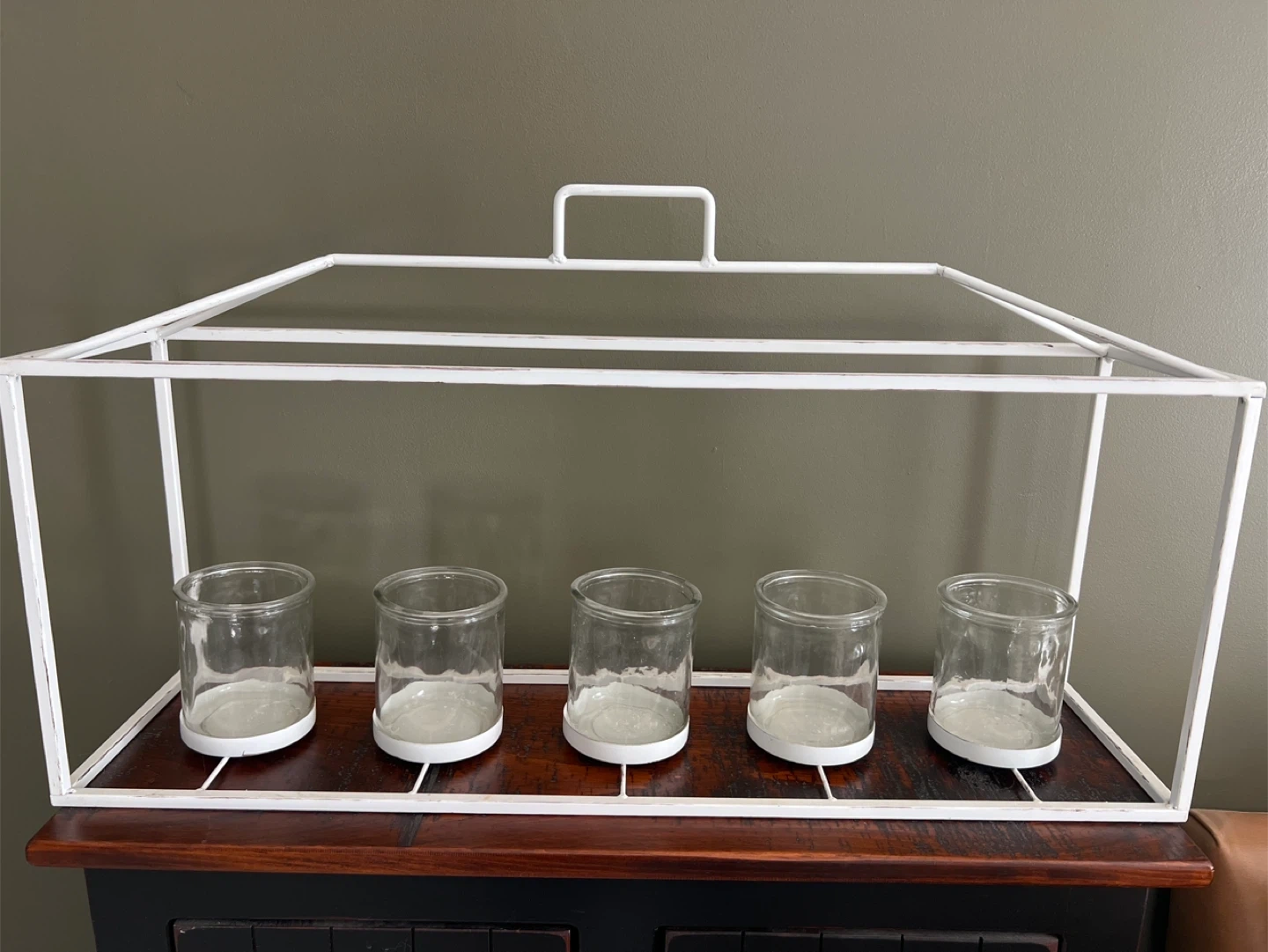 This set includes five glass candle holders with white rod iron frame. The holders are ready for your favourite candles or holiday decor. Perfect for tabletop or shelf display, this piece willadd a charming touch to any room.