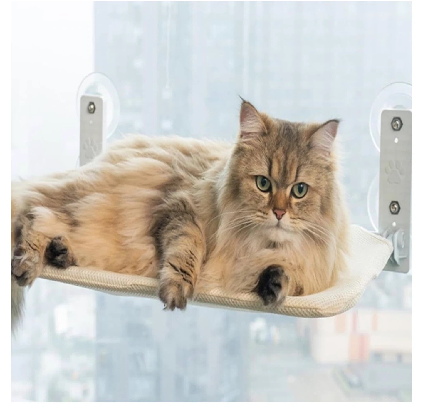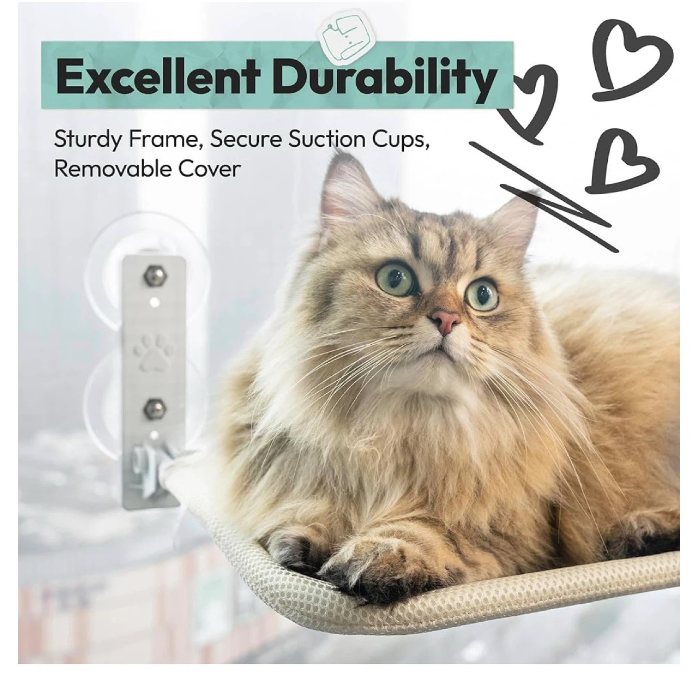 This is a cat hammock pet bed that attaches to windows using suction cups. It comes with a sturdy frame and secure suction cups for excellent durability. The cover is also removable for easy cleaning.