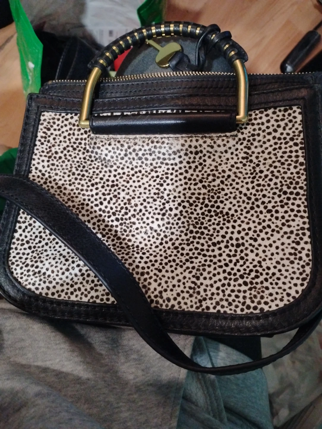 This Fossil satchel handbag features a black leather exterior with a cowhide print front panel. It has a top handle and a detachable crossbody strap. The bag includes a zipper closure.