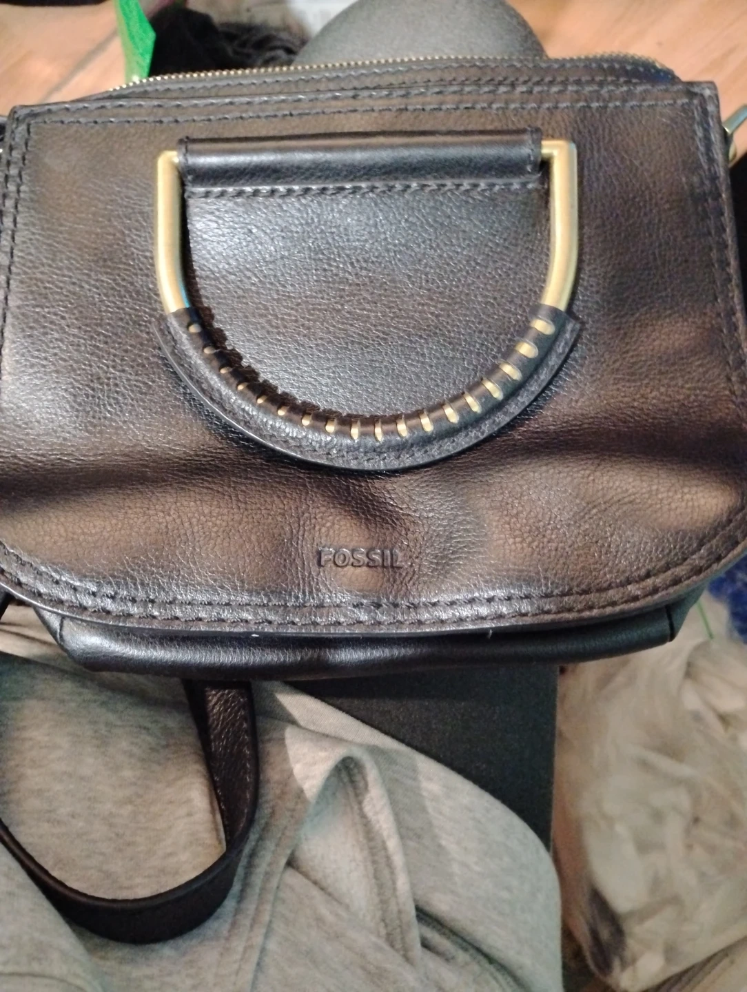 This Fossil satchel handbag features a black leather exterior with a cowhide print front panel. It has a top handle and a detachable crossbody strap. The bag includes a zipper closure.
