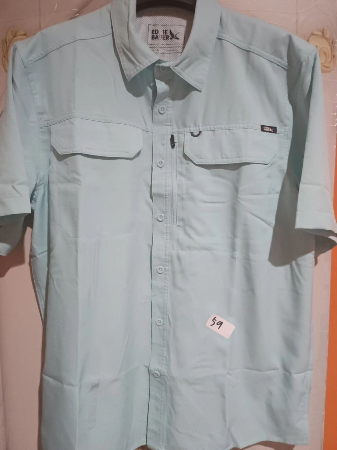 Eddie Bauer short sleeve men's shirt in light blue. Made of polyester. Size medium. It's a button-down style with two chest pockets and a zippered pocket.