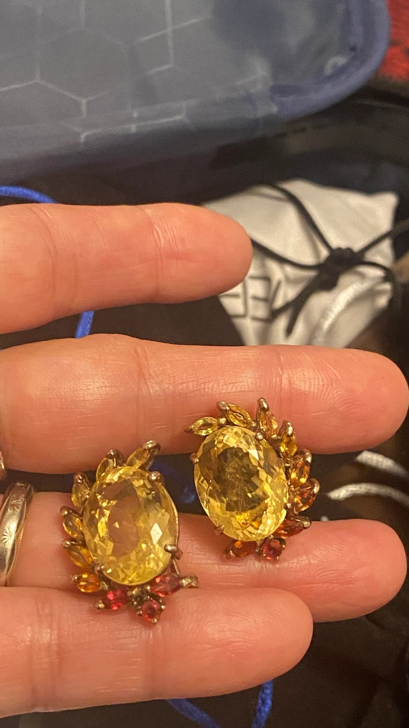 Beautiful cluster earrings featuring large oval yellow gemstones surrounded by smaller red and orange stones. These would add a pop of colour to any outfit! Real silver and real yellow sapphire gold plated earrings.