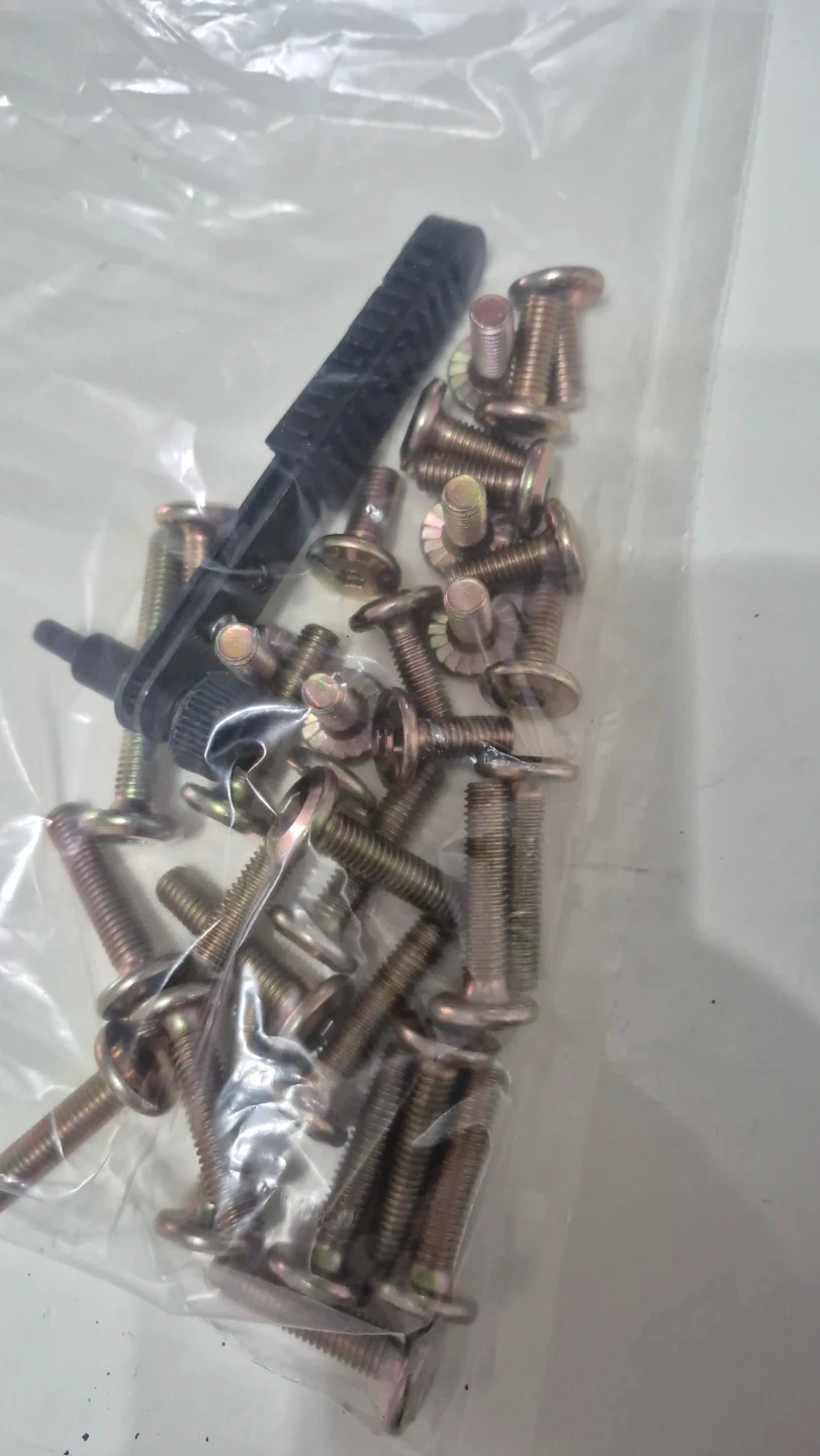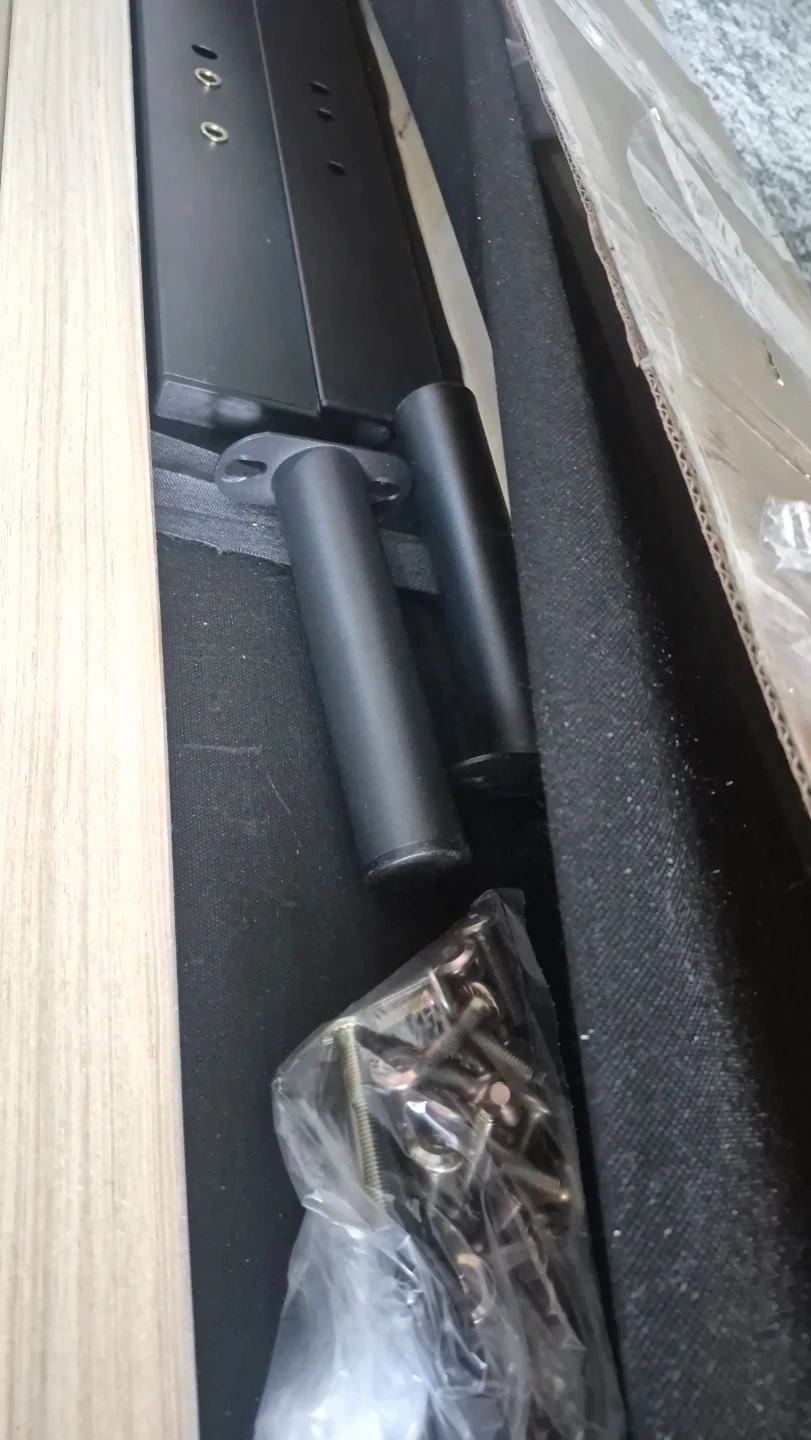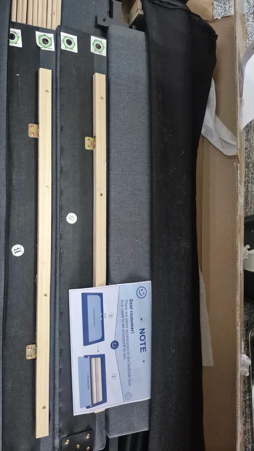 It's a grey upholstered bed frame with a plan design headboard. Includes metal legs and screws for assembly. This frame is designed for a .