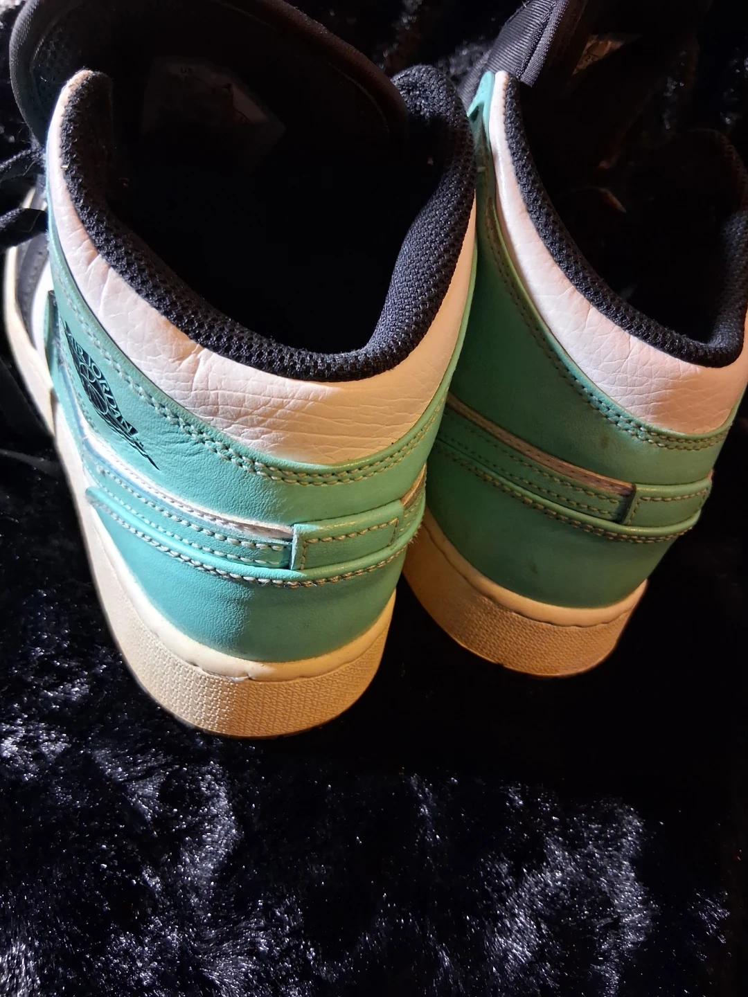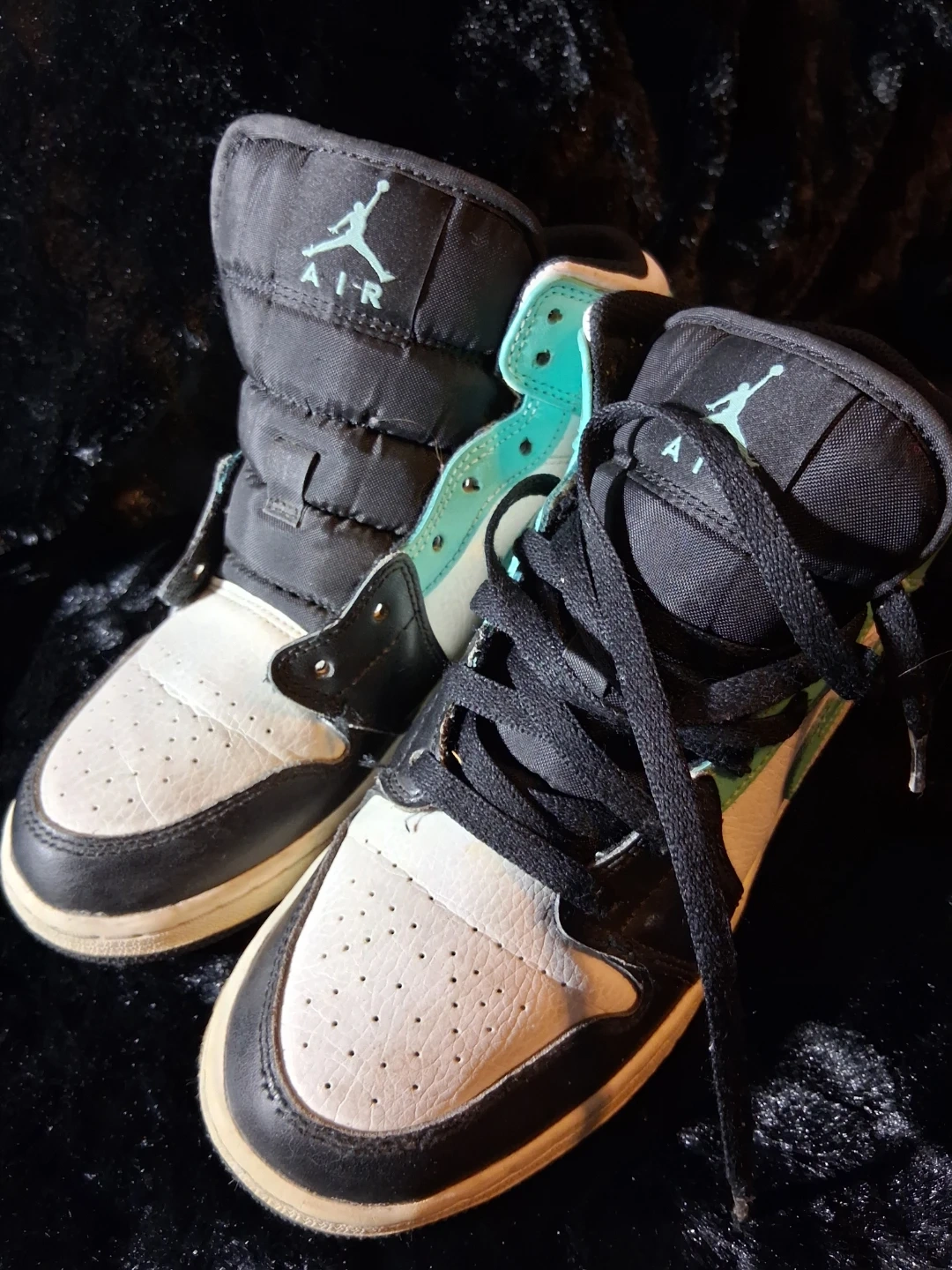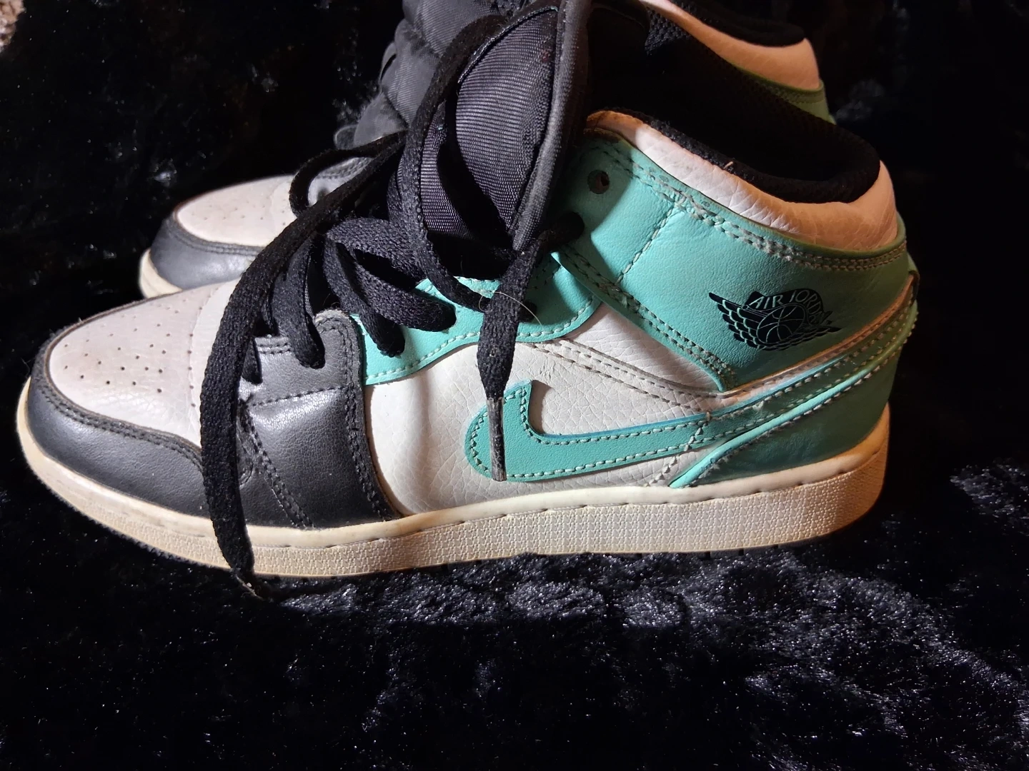 These are Air Jordan 1 Mid SE sneakers. They feature a mix of leather and textile materials. The design includes the iconic Nike Air Jordan Wings logo.