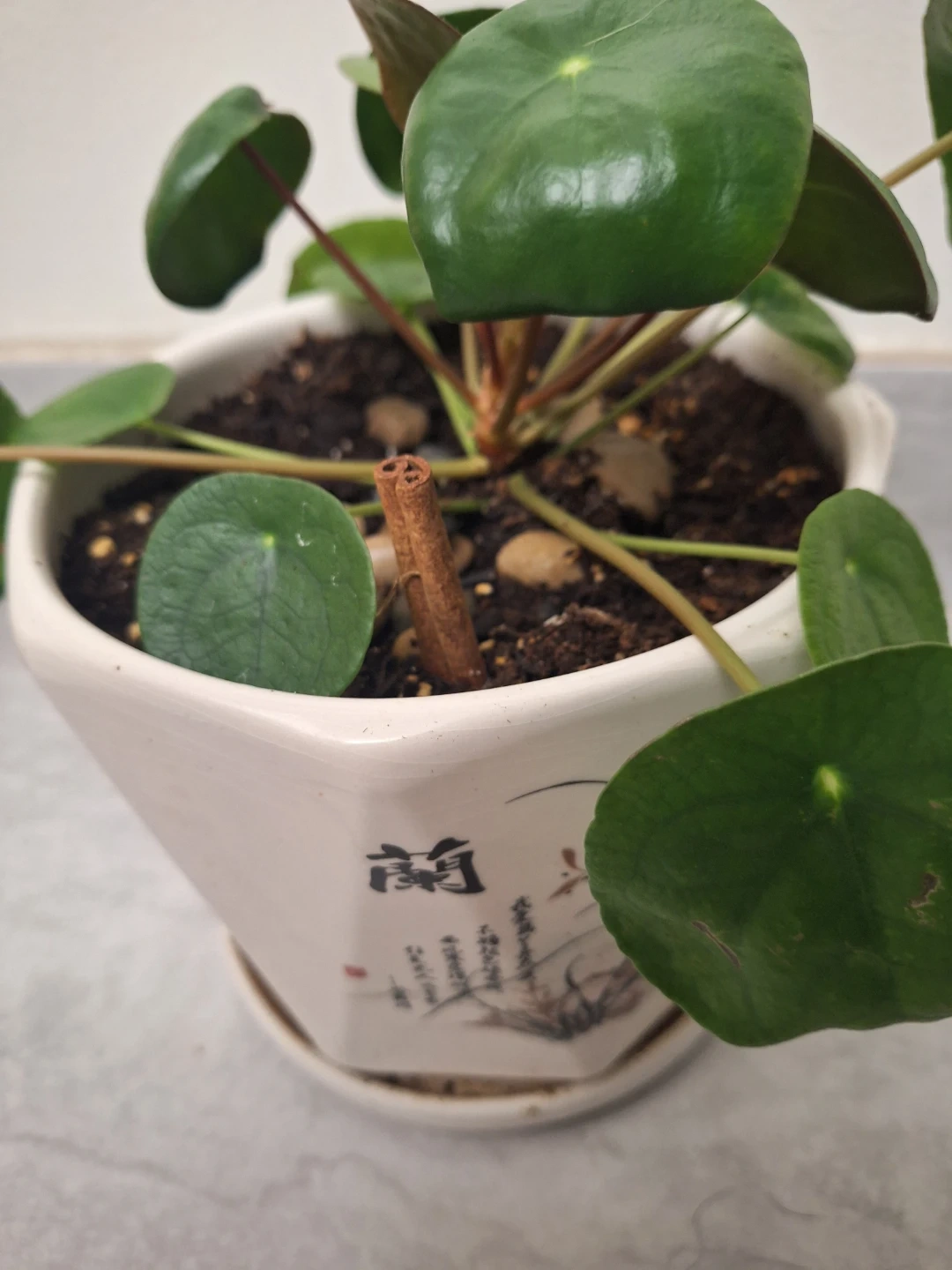 Chinese Money Plant in White Pot in Chinese pot