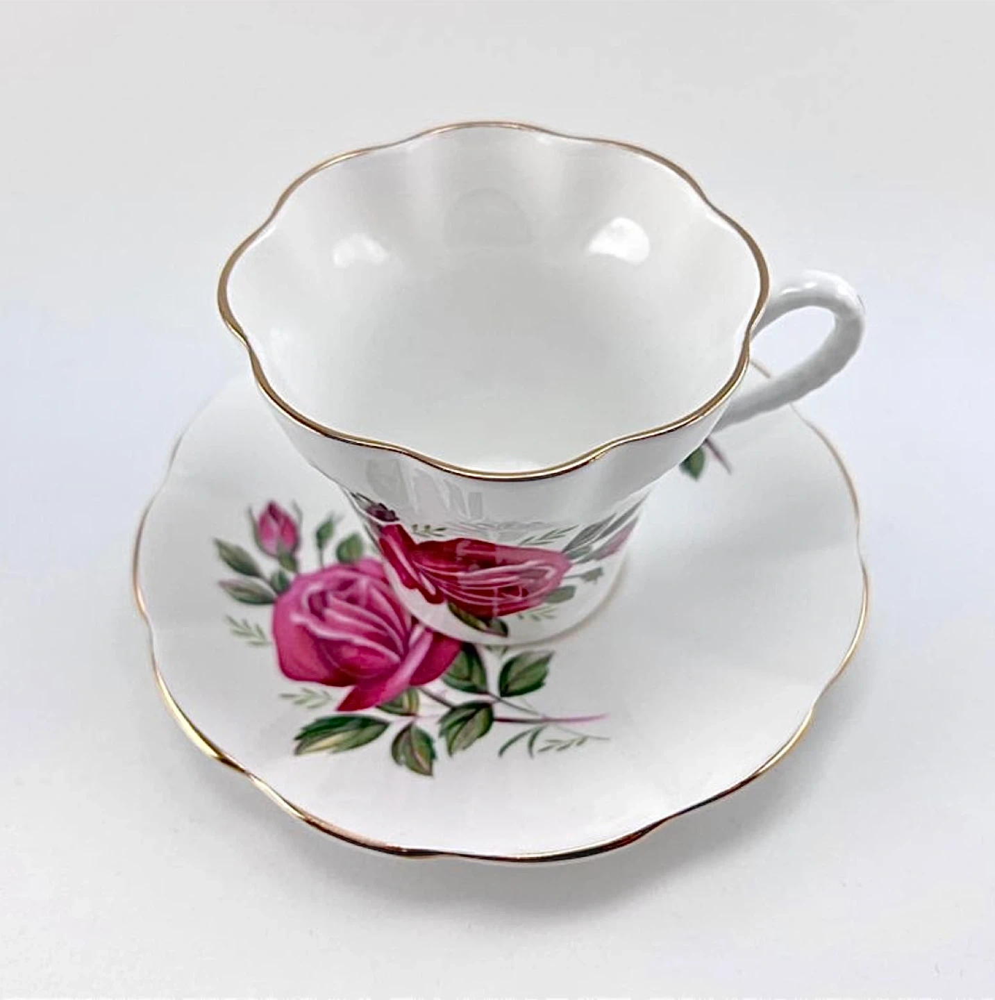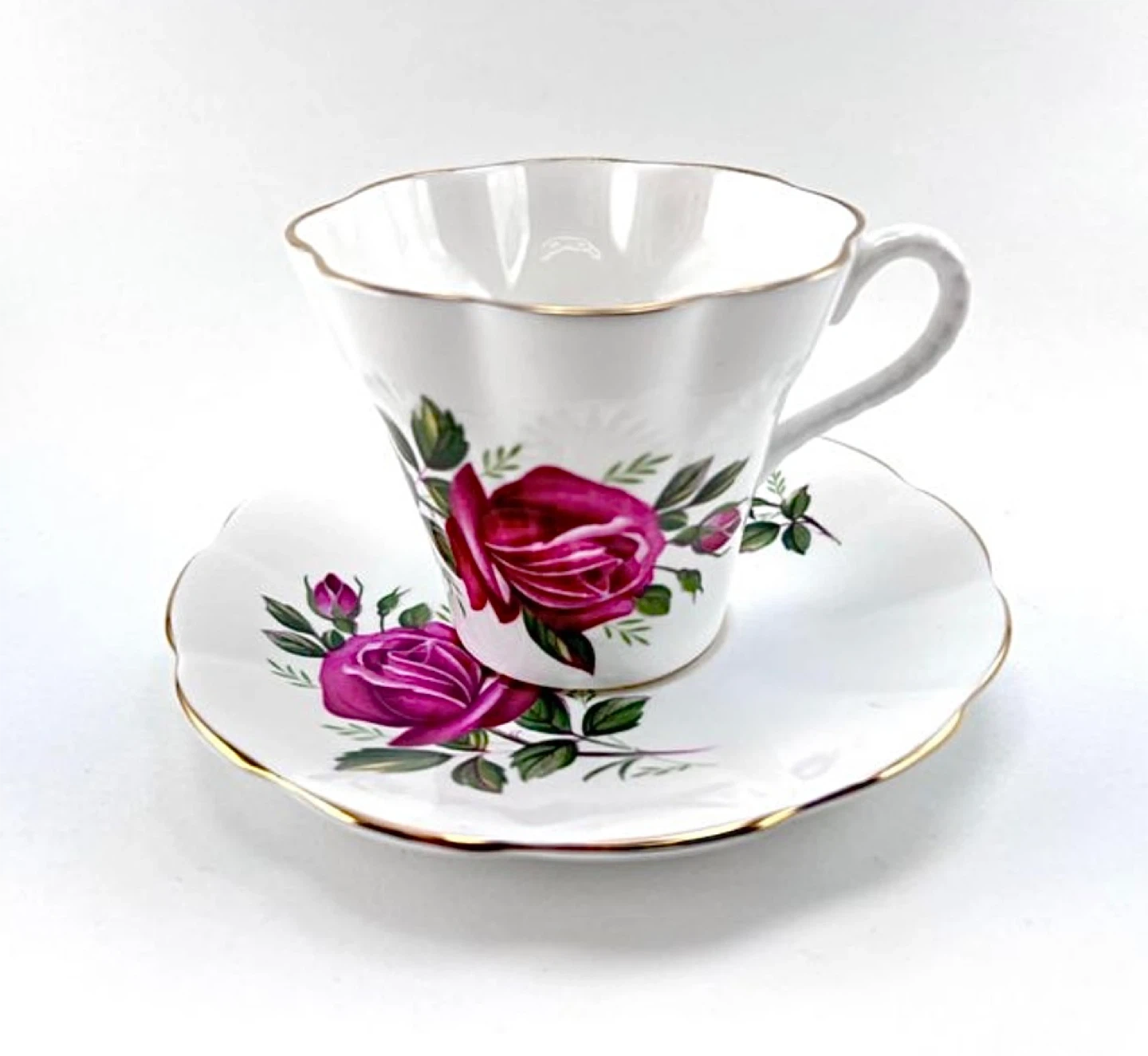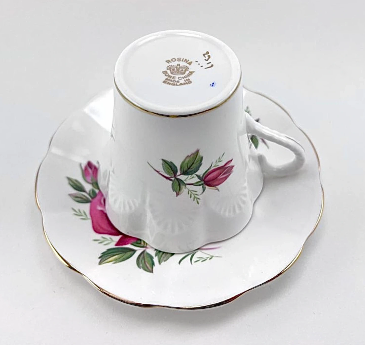Vintage Rosina bone china teacup featuring large rose pattern. No chips, cracks, crazing or gold loss. Both pieces ping/ring