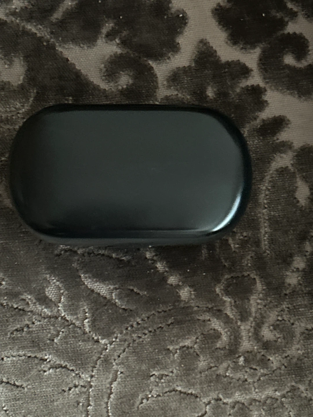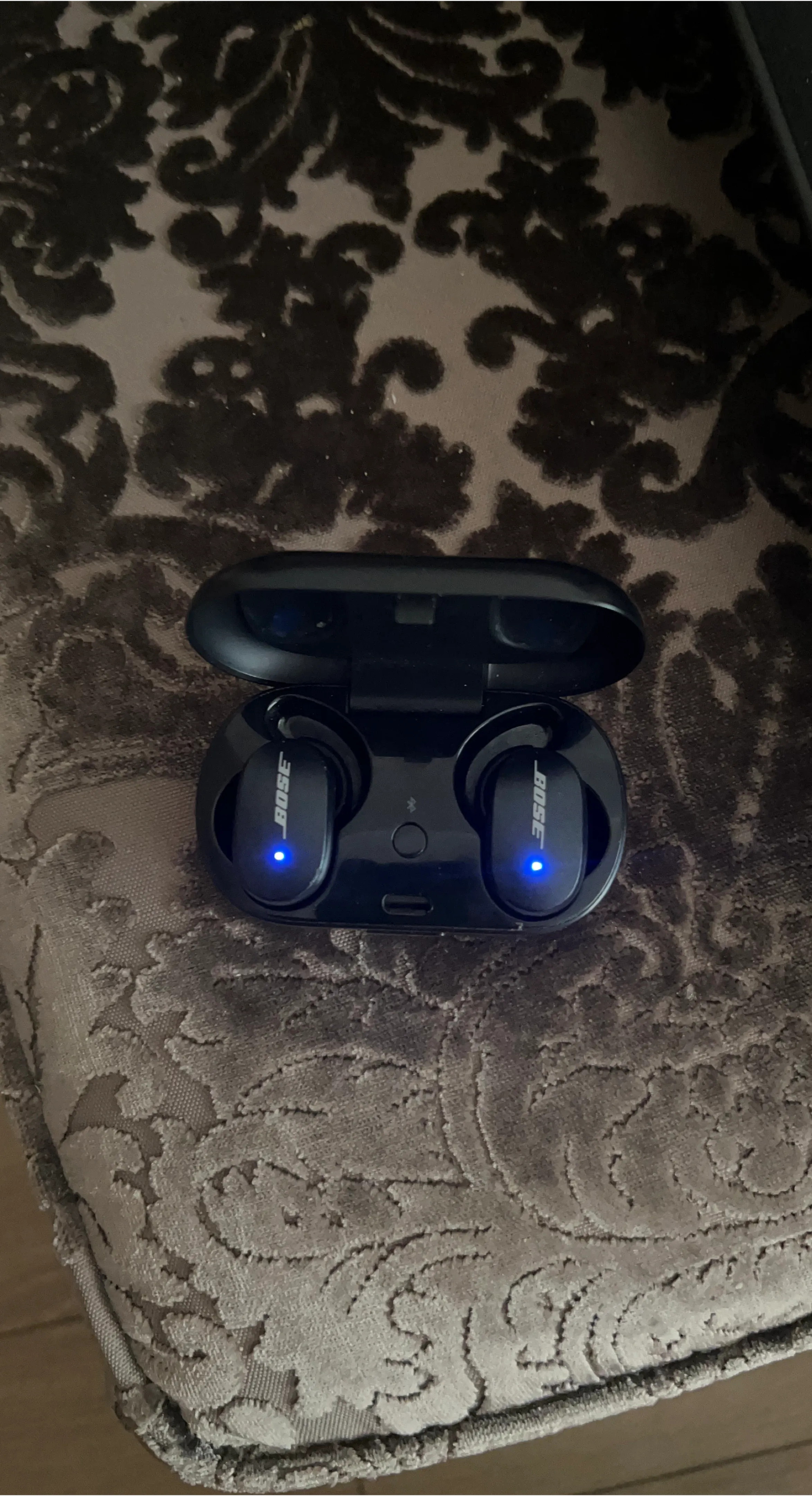 These are Bose true wireless earbuds in black. They come with their charging case. The earbuds are powered on and connected, indicated by the blue lights.