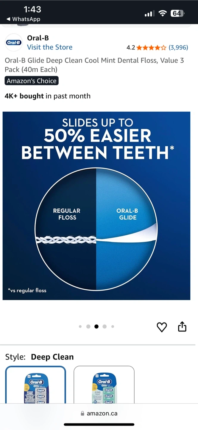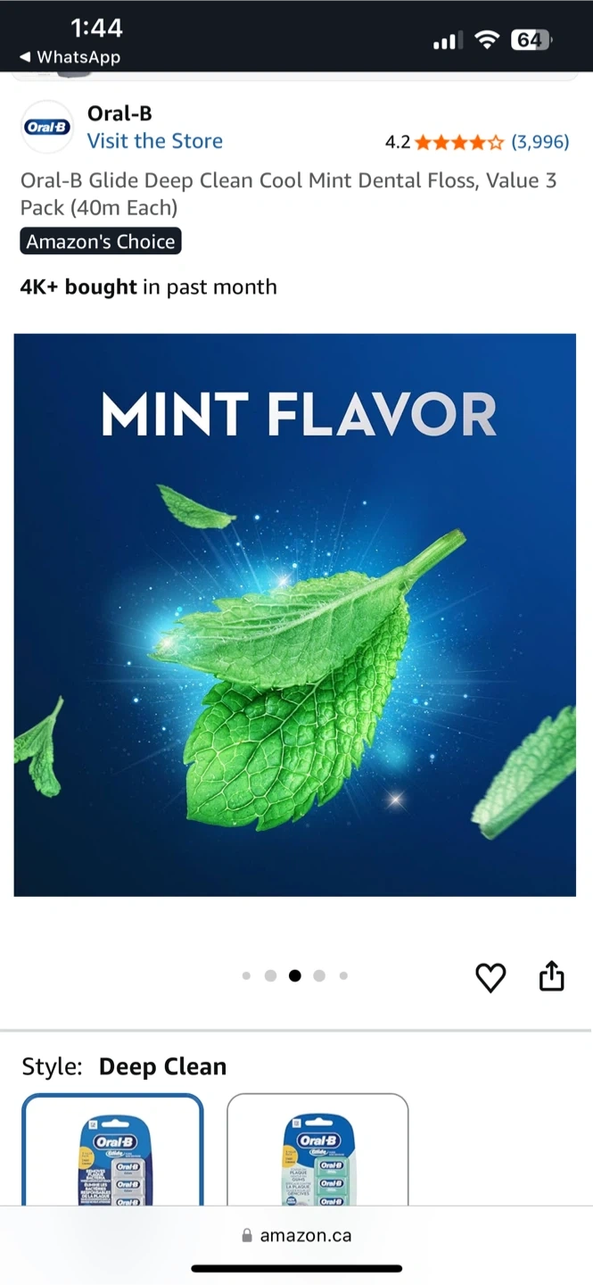 Oral-B Glide Deep Clean Cool Mint dental floss. This value pack includes 3 units, each 40m long. It's smooth, strong, and shred-resistant for easier cleaning between teeth.