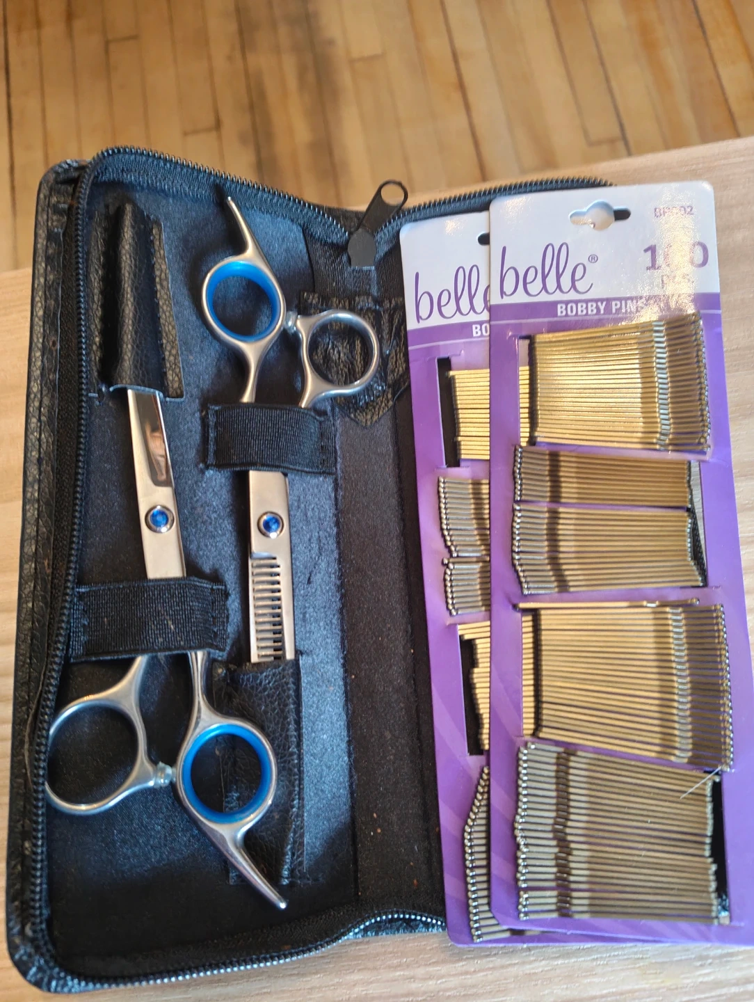 This Belle Professional kit includes a pair of hair cutting shears and a comb shear, all housed in a black zipper case. It also comes with a package of 100 gold bobby pins. Perfect for home haircuts or styling touch-ups!