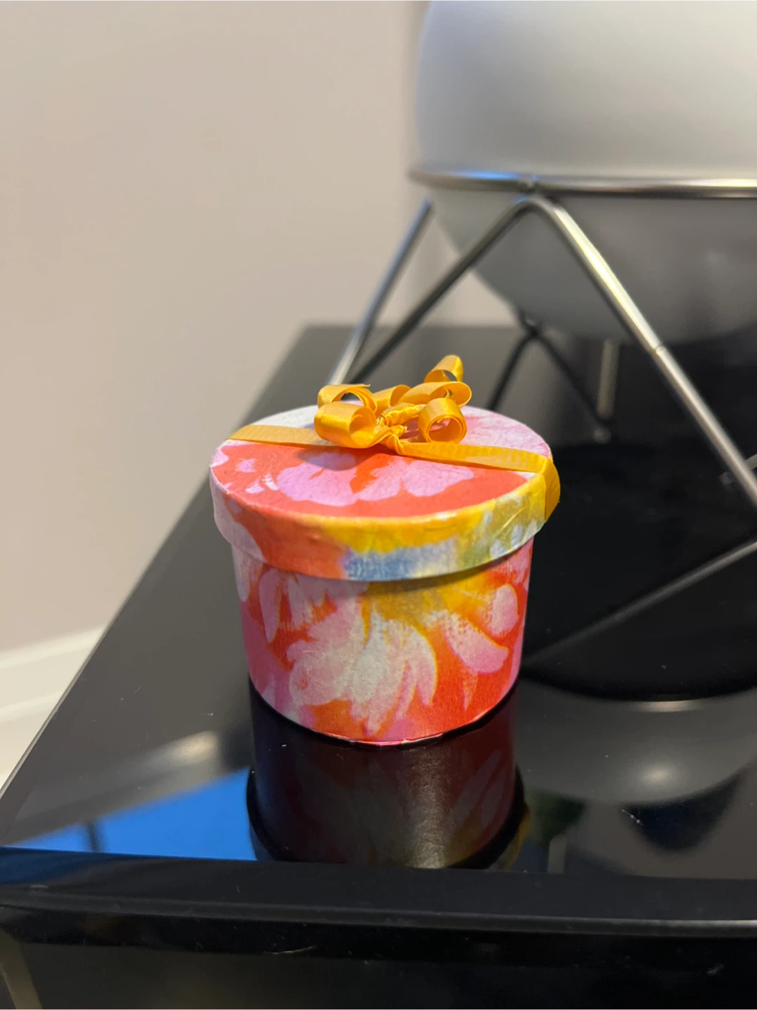 A cute little floral round gift box, perfect for small trinkets or presents! It has a lovely design and a sweet ribbon on top, adding a touch of charm