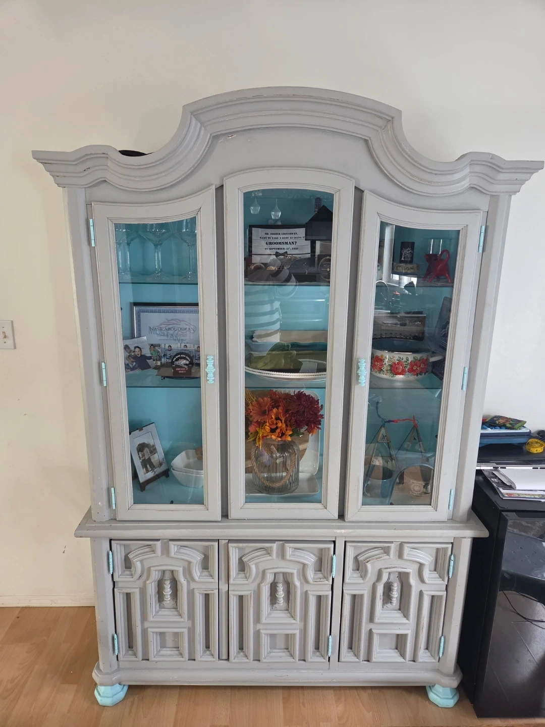 This china cabinet features a grey painted finish with a bright teal interior and decorative front panels. It has three glass doors on top and three cabinet doors on the bottom. Great for displaying dishes or collectibles!