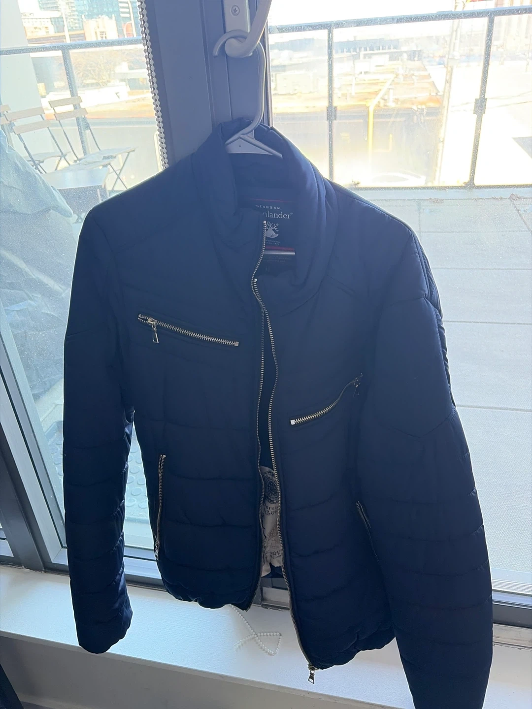 Navy blue puffer jacket by The Original Greenlander. It's a stylish and warm outerwear piece. Features zippered pockets and a full-zip front closure.
