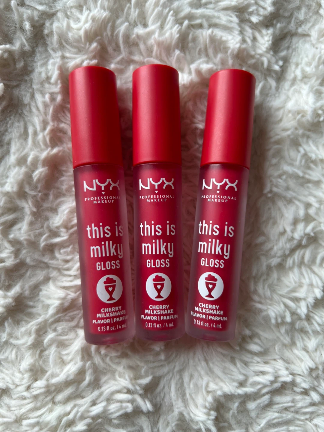 Three NYX This is Milky Gloss lip glosses in the Cherry Milkshake flavour. It's a creamy, hydrating formula for a soft pout. Great for a subtle, glossy look!