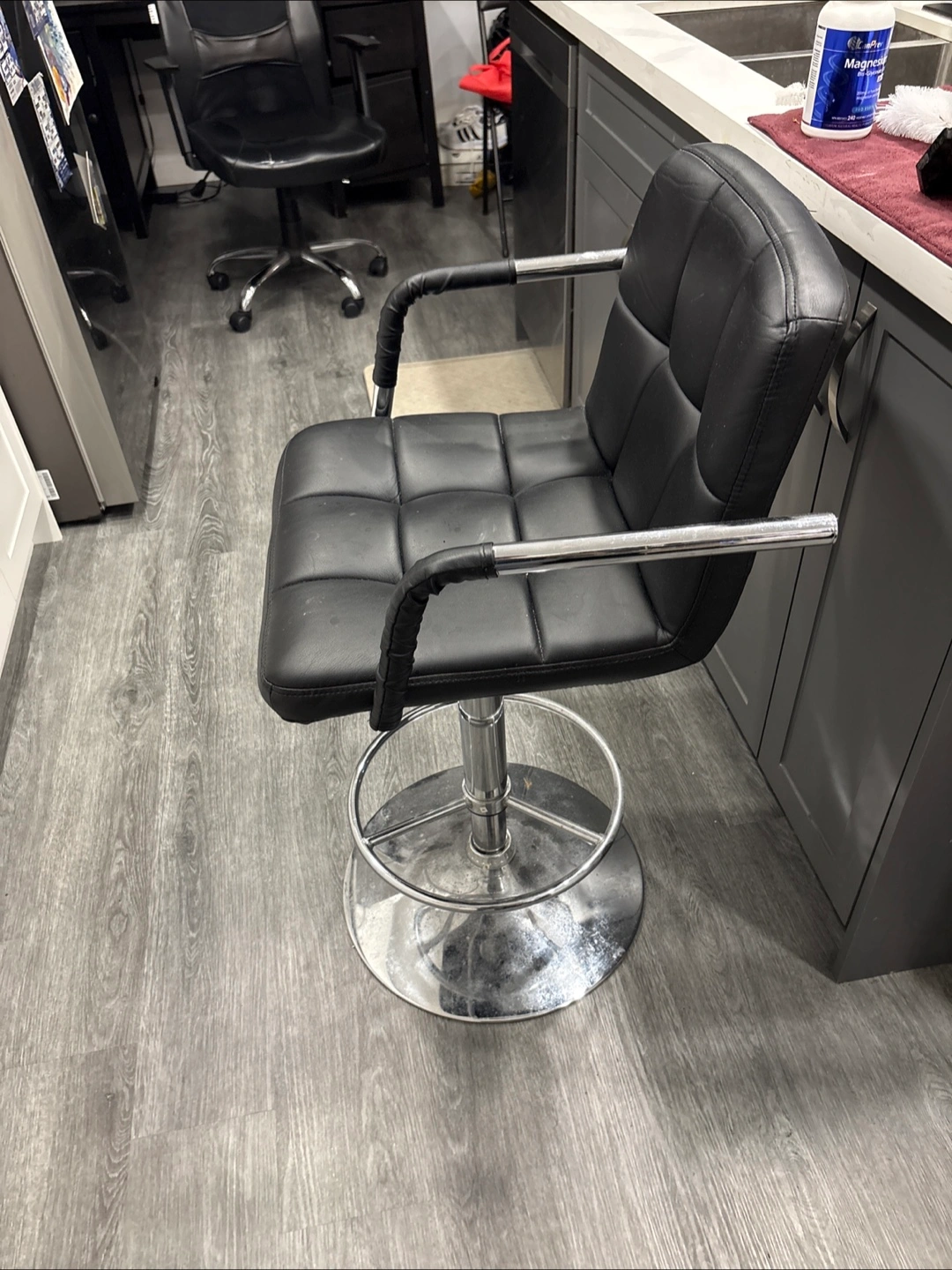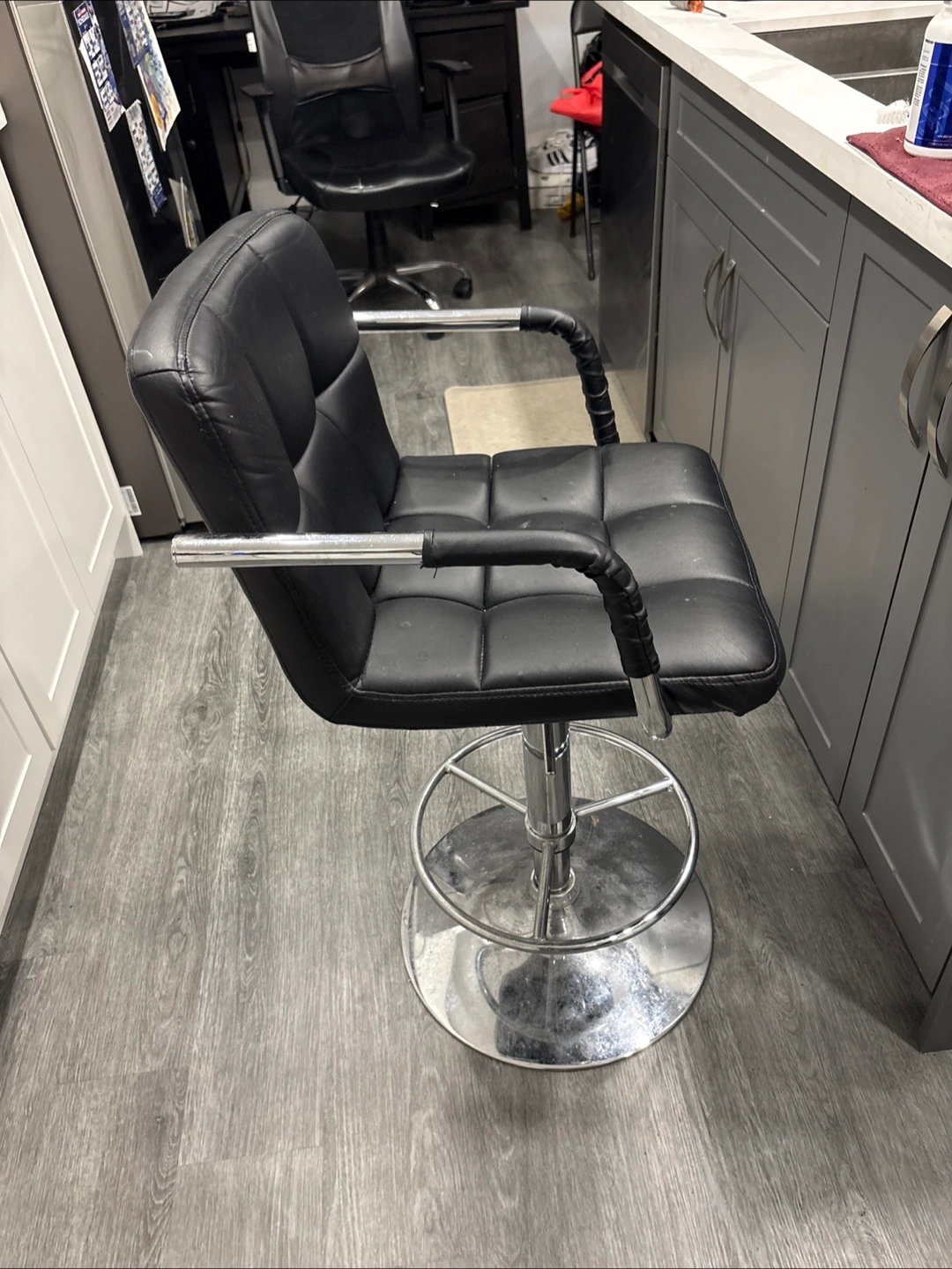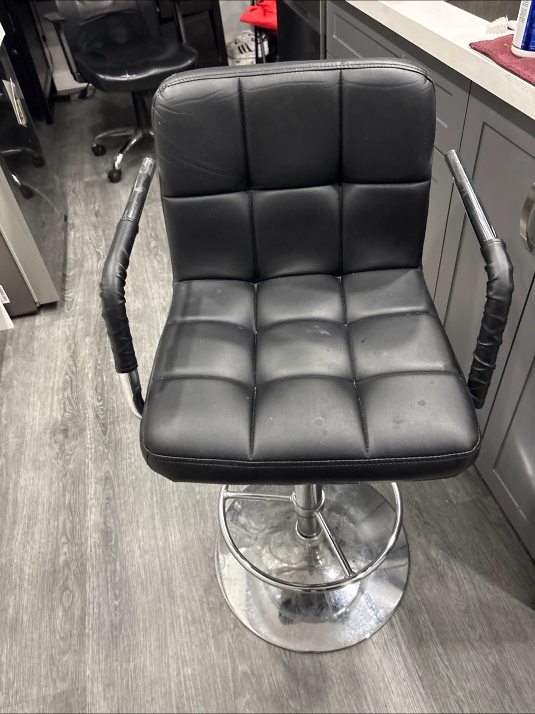 Selling a bar stool in used condition. It's black and has an adjustable height feature. Perfect for a kitchen island or bar area