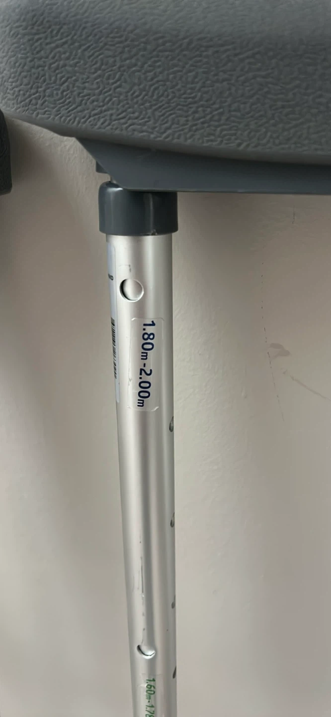 Pair of adjustable aluminum crutches. They're designed for individuals between 150cm to 180cm . These crutches have comfortable hand grips and padded armrests.