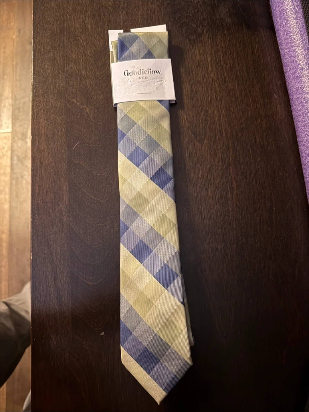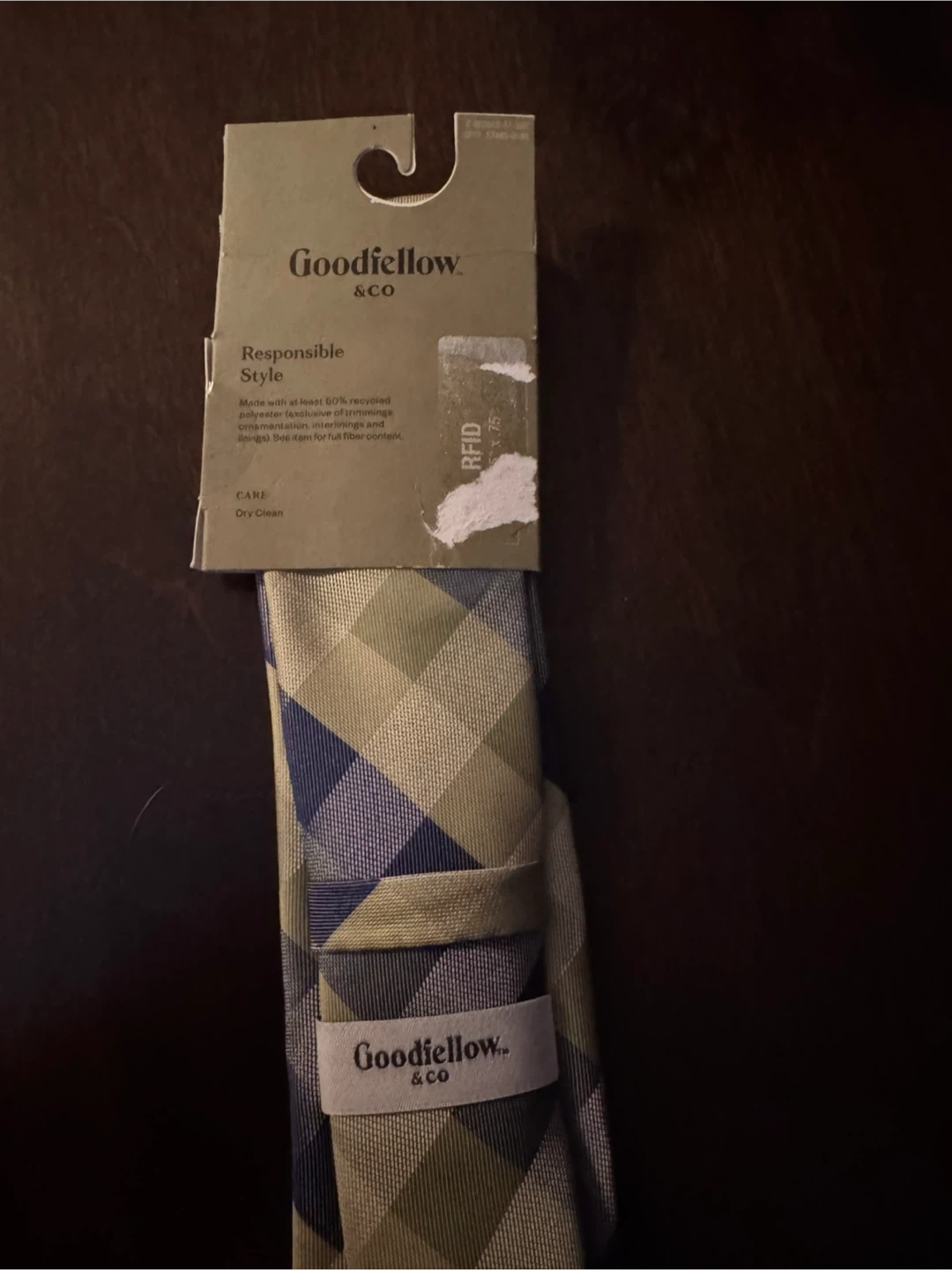A Goodfellow & Co tie with a green, blue, and tan plaid pattern. It's made with at least 50% recycled polyester. Care instructions say dry clean only.