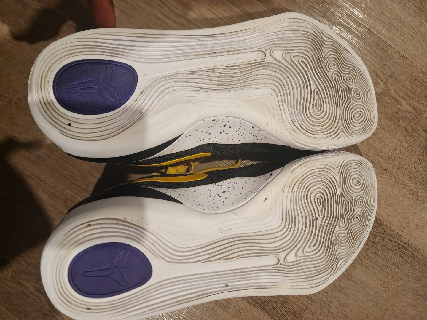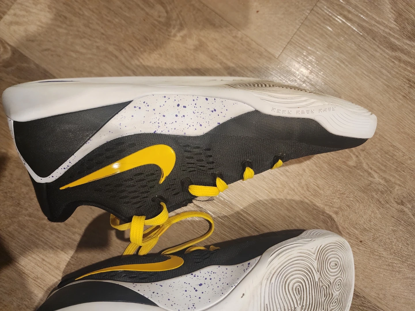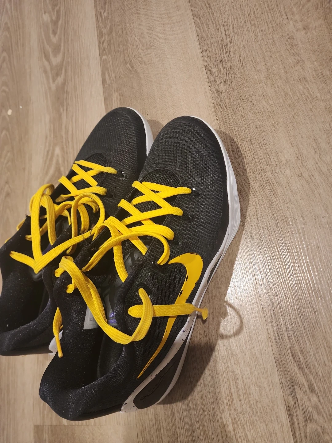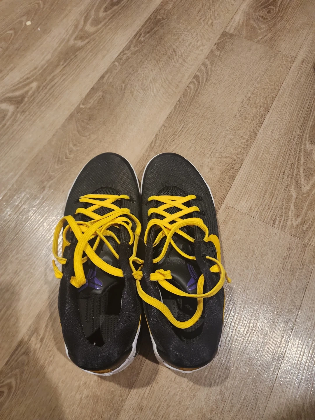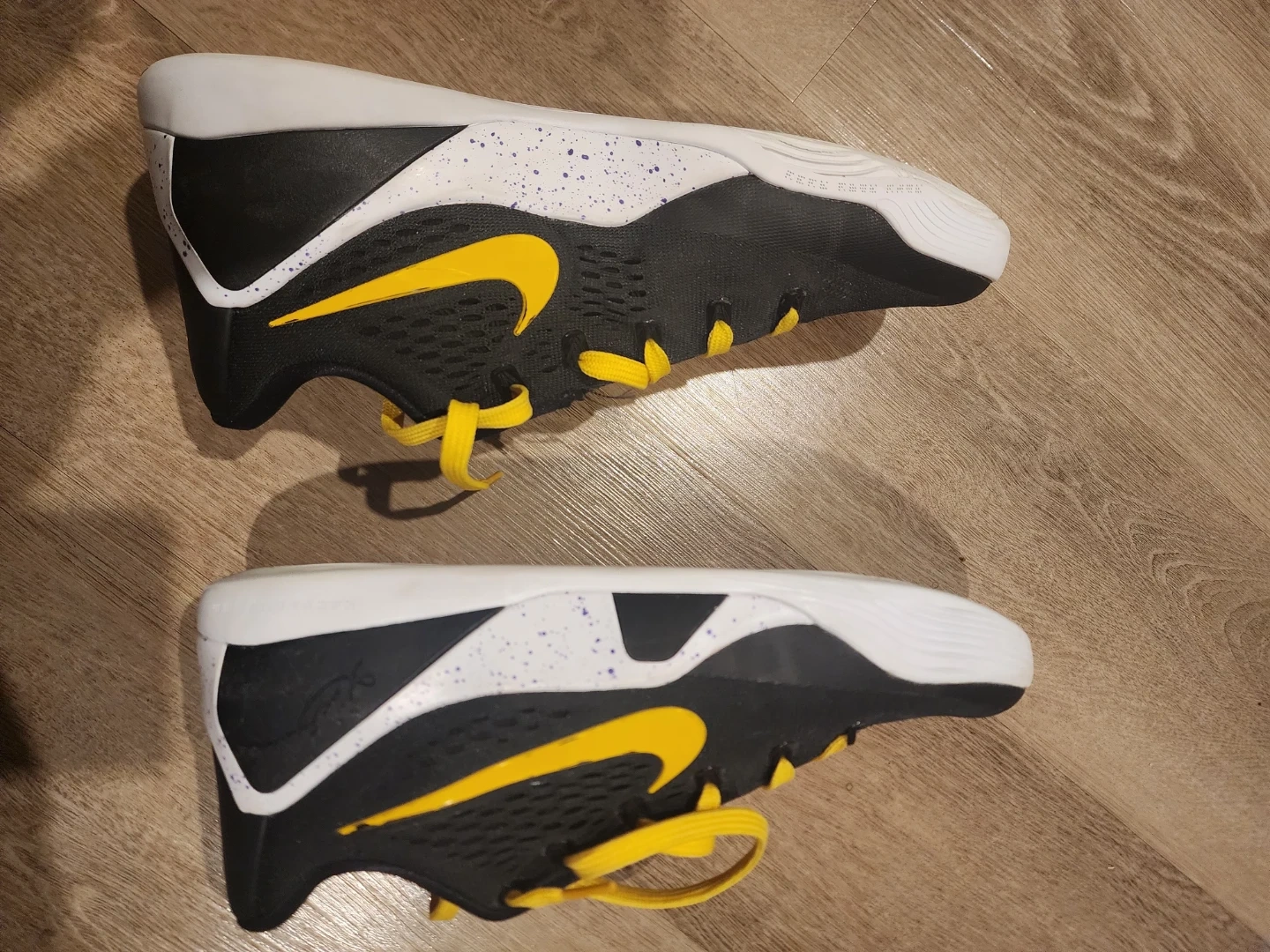 Black and yellow Nike Kobe IX Elite Low EM Protro basketball shoes. Features a durable mesh upper and a supportive midsole. Great for the court!