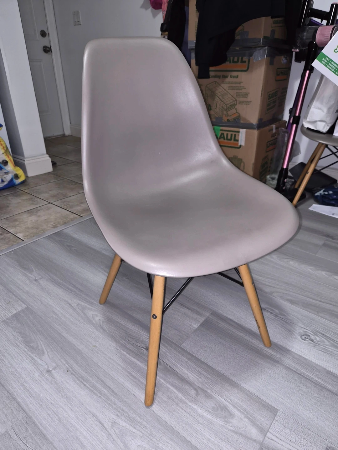 This chair has a moulded grey seat and natural wood legs. It's a stylish addition for any dining area or workspace. A comfy seat for everyday use!