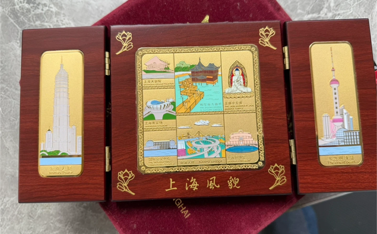 This is a beautiful display featuring gold-plated landmarks of Shanghai, presented in a lovely wooden and velvet case. It's a unique piece to showcase the style and features of Shanghai's iconic locations