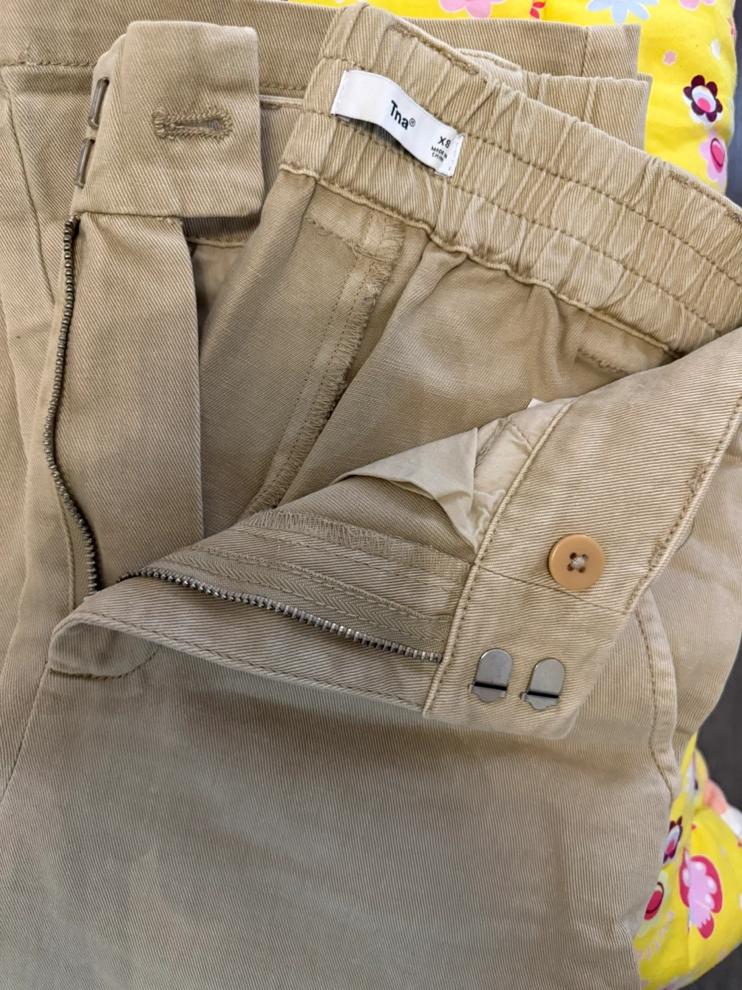 These are khaki cargo pants from Tna. They're size XS. The pants have a zipper fly and button closure. Never worn