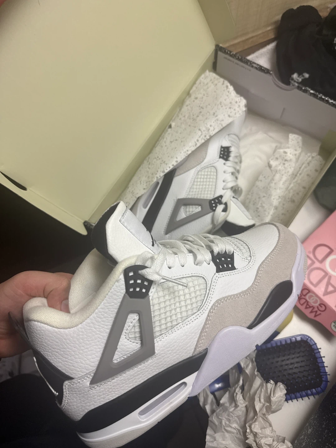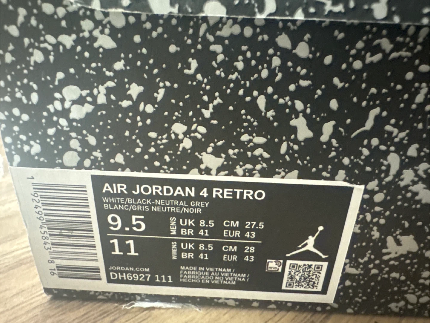 Selling a pair of Air Jordan 4 Retro in white, black, and neutral grey. They are a men's size 9.5 (UK 8.5, EUR 43, 27.5 cm). Comes with the original box!