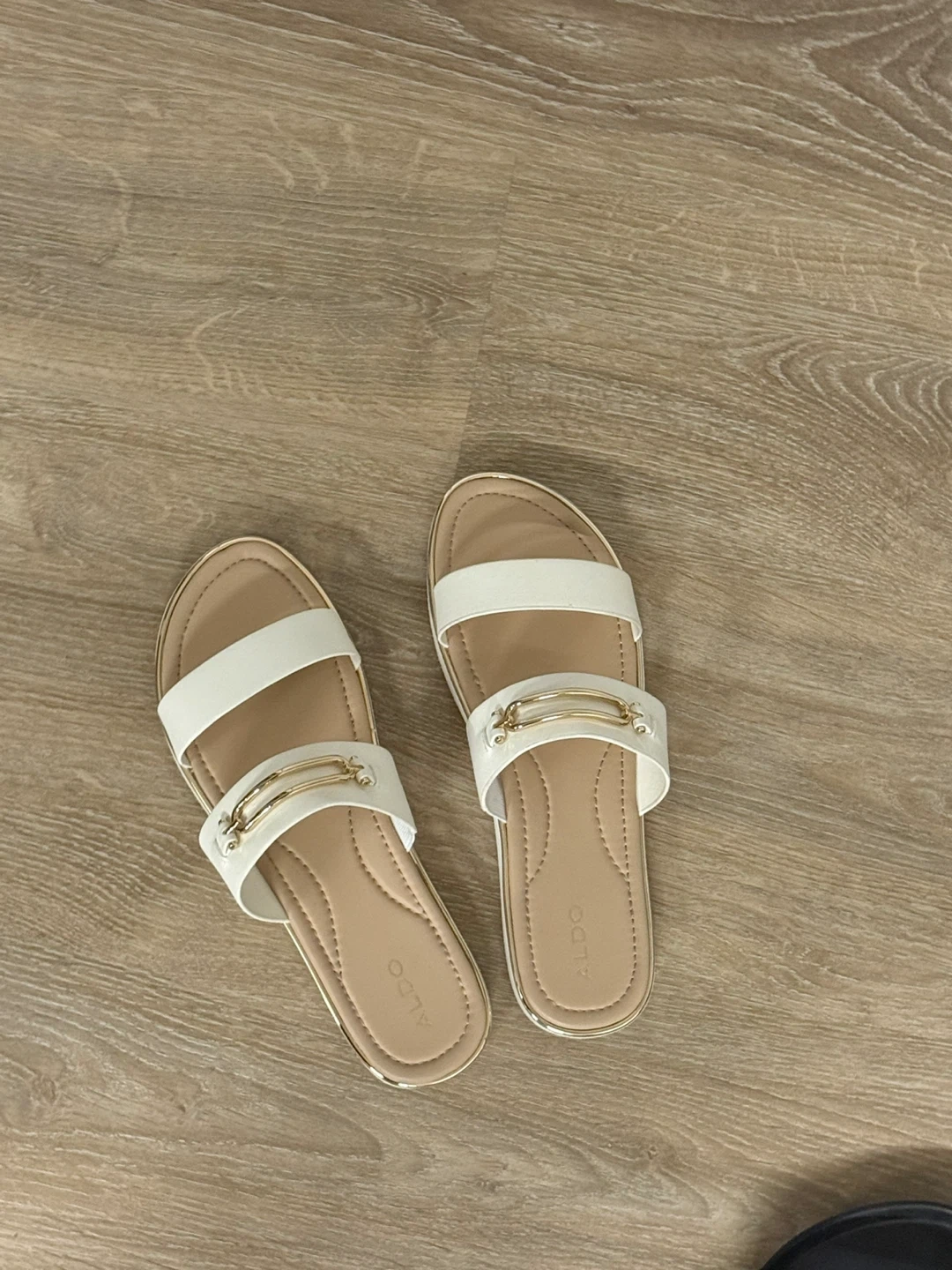ALDO women's slide sandals in a classic white colour. These sandals feature a stylish gold-toned hardware accent on the strap. They have a comfortable footbed with stitched detailing. Perfect for casual everyday wear!