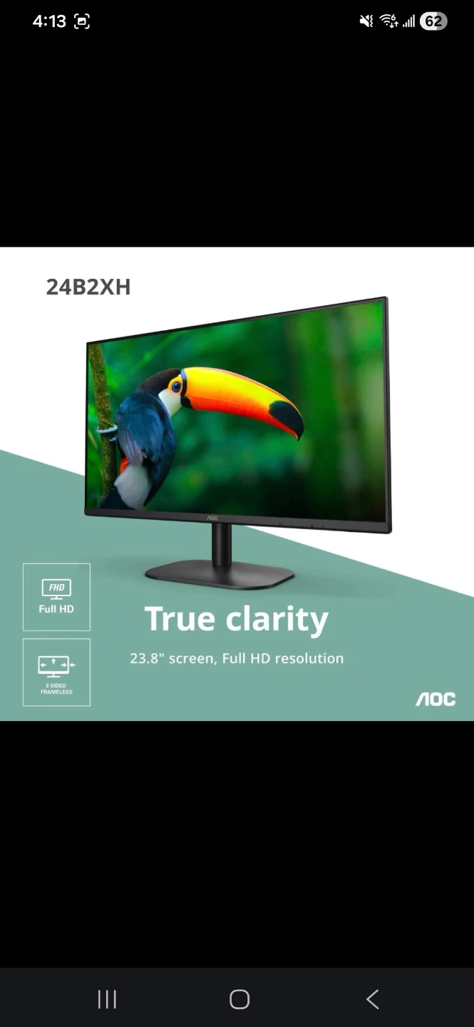 Selling an AOC 24B2XH monitor with a 23.8" screen and Full HD resolution. It offers true clarity in a frameless design. Perfect for everyday use!