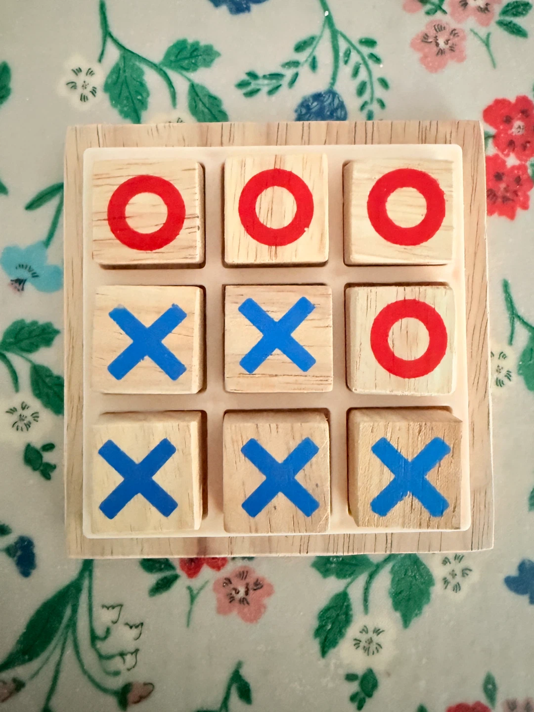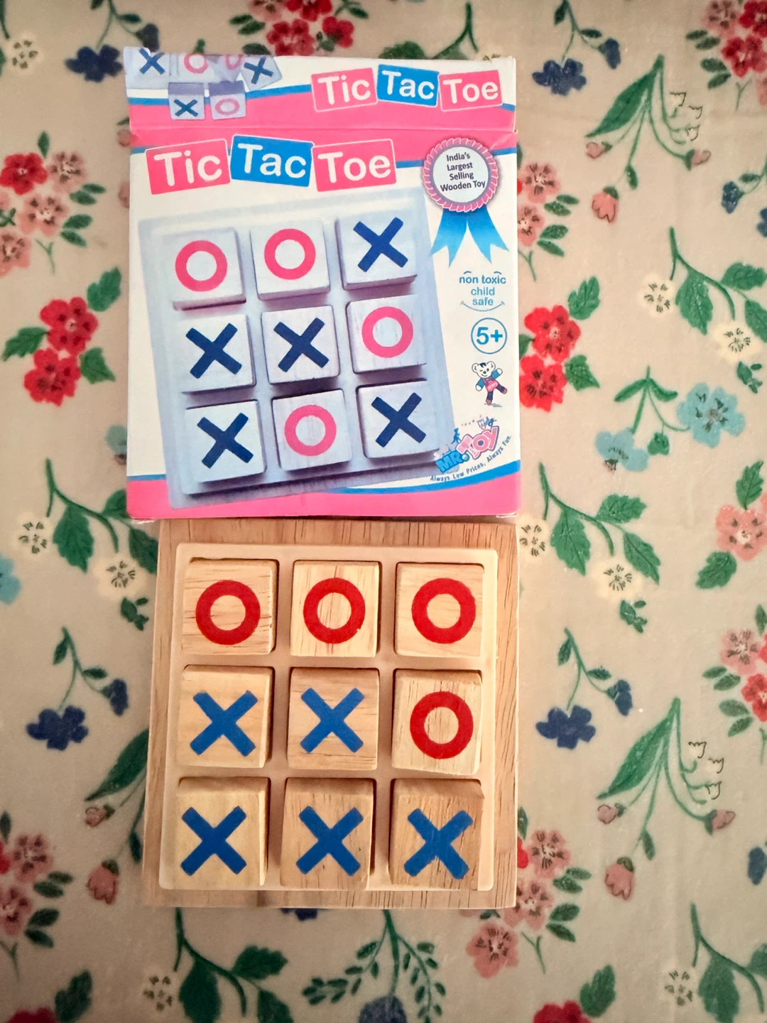 Classic wooden tic tac toe game set with wooden X and O pieces. Made of natural wood, it's a fun and engaging game for kids and adults. Suitable for ages 5 and up!
