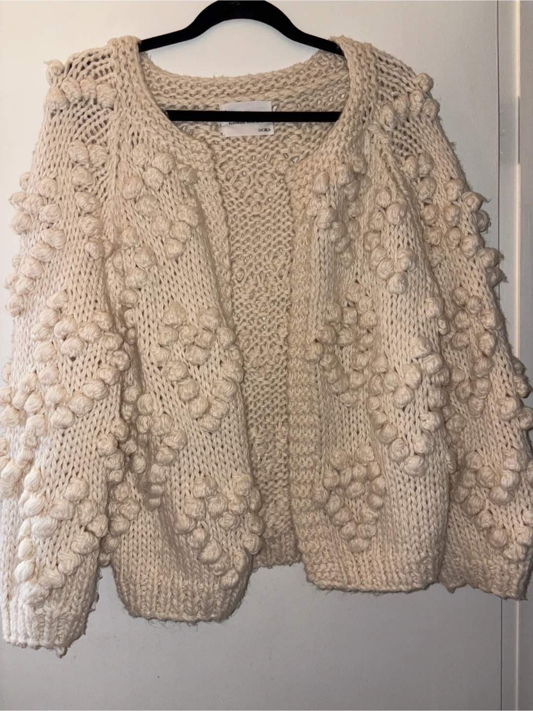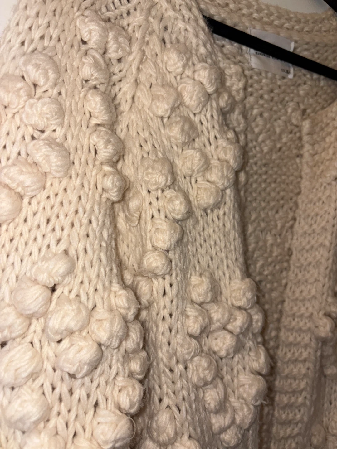 This Chicwish cardigan is cream coloured with a chunky cable knit design and bobble details. It's made with 40% wool and 60% acrylic. This sweater is perfect for staying cozy on cooler days!