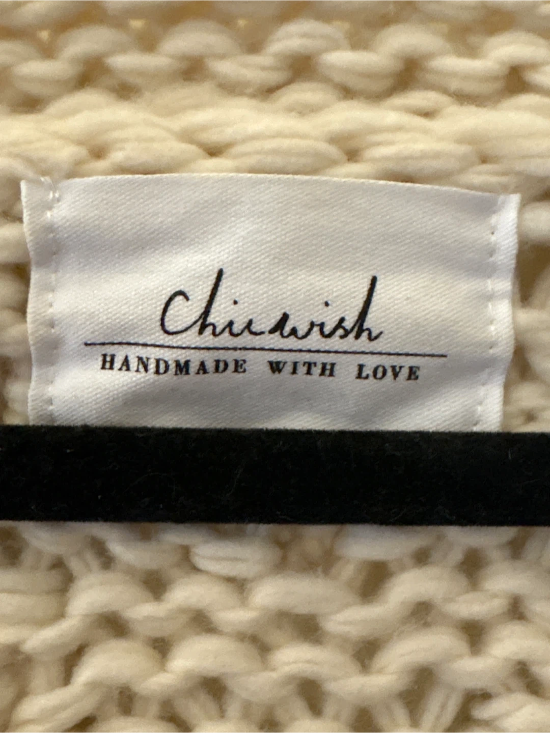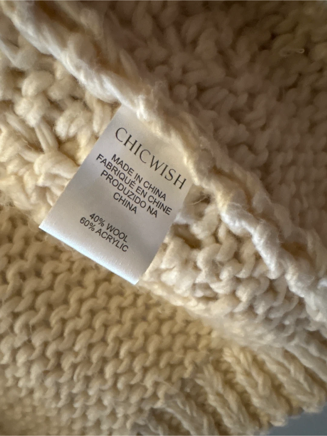 This Chicwish cardigan is cream coloured with a chunky cable knit design and bobble details. It's made with 40% wool and 60% acrylic. This sweater is perfect for staying cozy on cooler days!