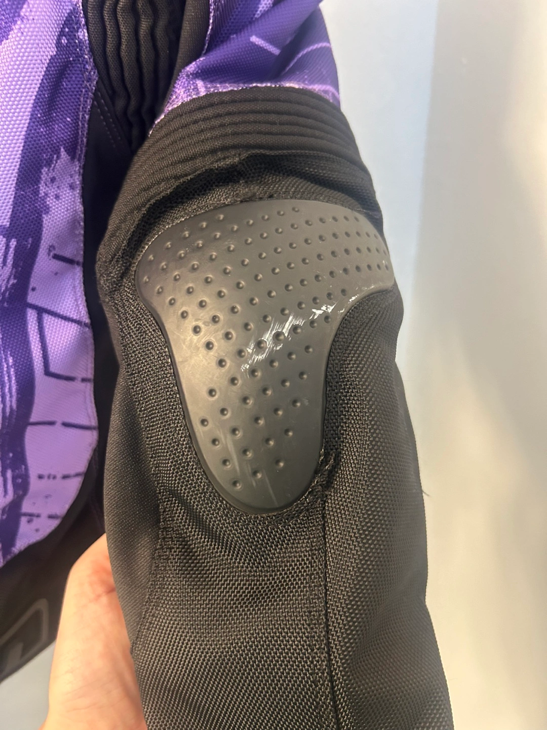 Selling used almost like new small Icon women's motorcycle jacket. Back, elbow & forearm protection. Little scuff on right elbow shown in photo but very well kept. Removable insulated liner. Nice bright purple colour is eye catching :)