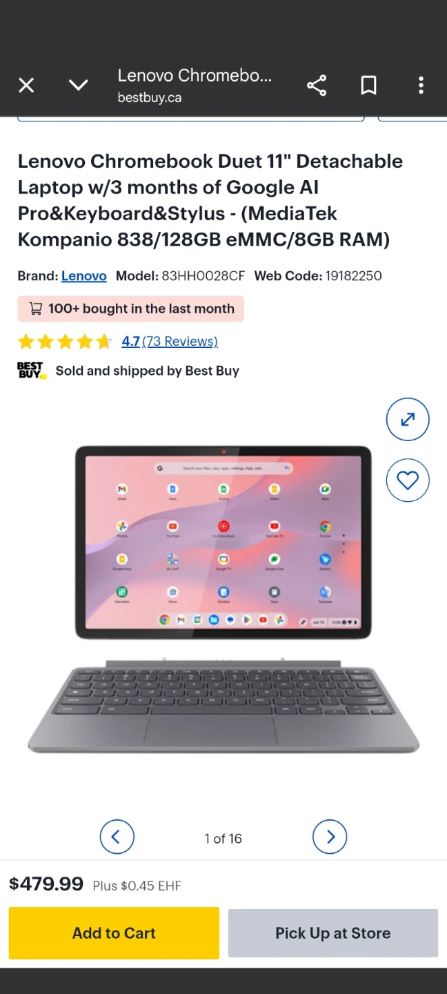 Selling a Lenovo Chromebook Duet 11" with a detachable keyboard. It's in great condition and ready for a new user! This model comes with 3 months of Google AI Pro & Keyboard and Stylus. It features a MediaTek Kompanio 838/128GB eMMC/8GB RAM. Originally bought for $479.99.