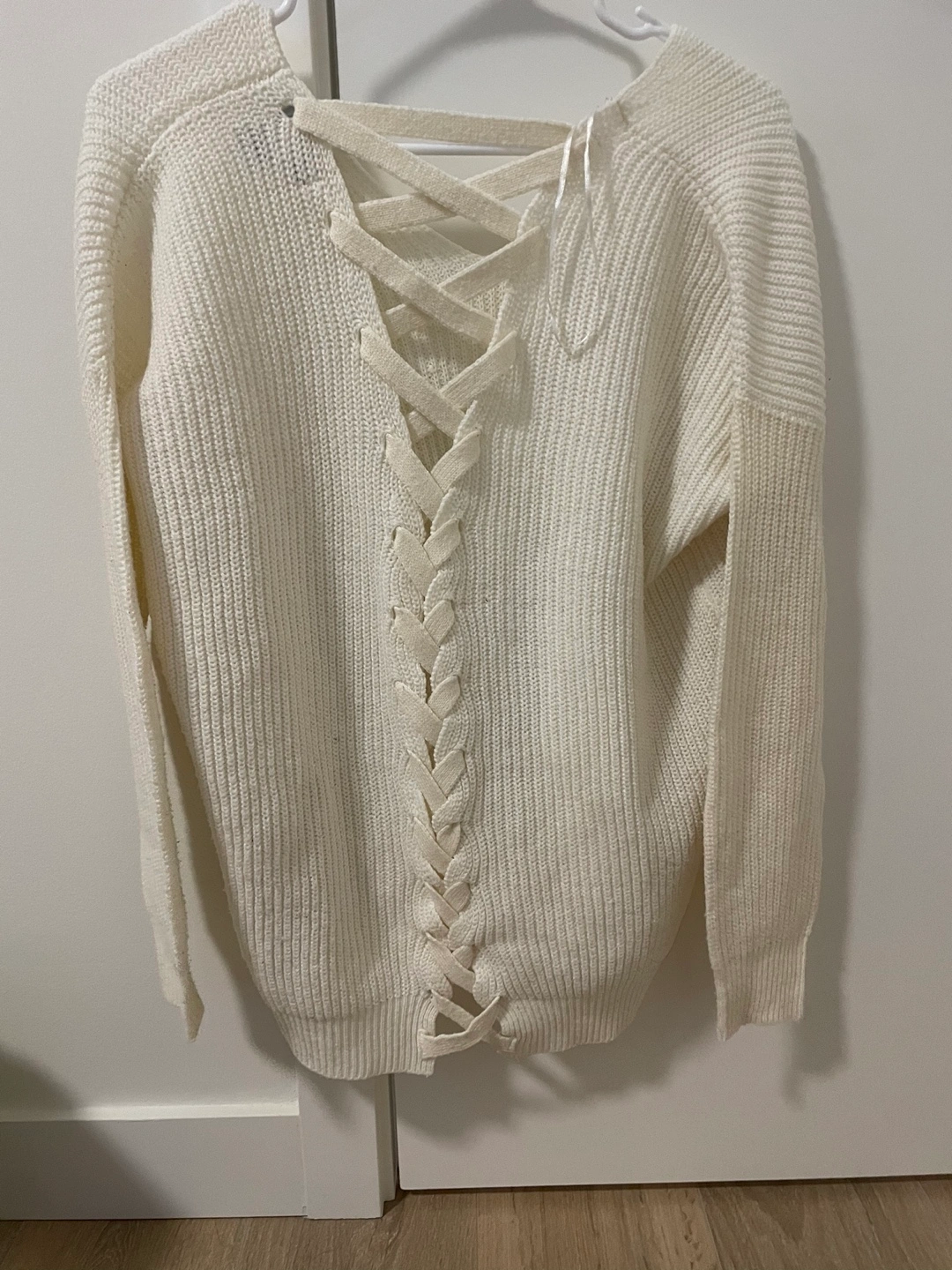 Women's cream knit sweater. Features a V-neck and unique criss-cross lace-up detail at the back. Long sleeves. Relaxed fit. Soft and comfortable material. Perfect for layering or wearing on its own.