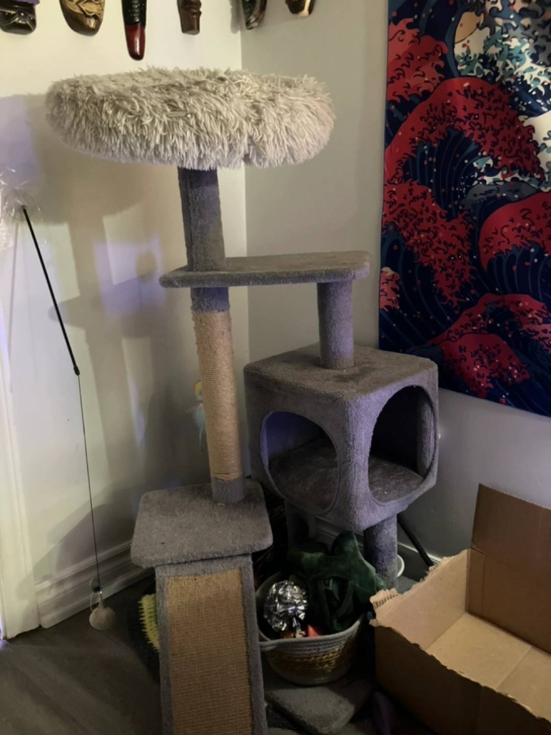 Multi-level cat tree with scratching posts and a plush top. Grey and beige in colour.