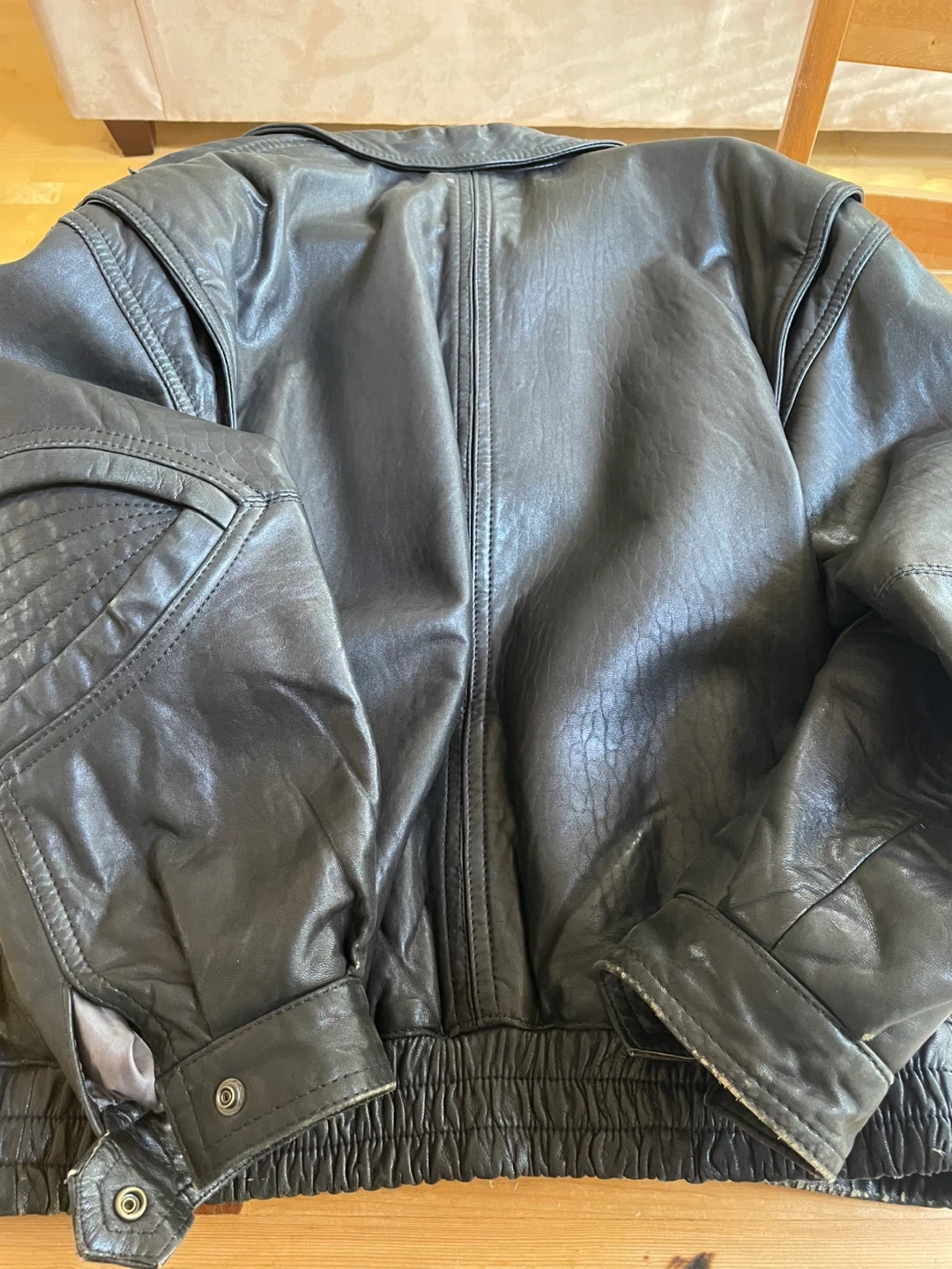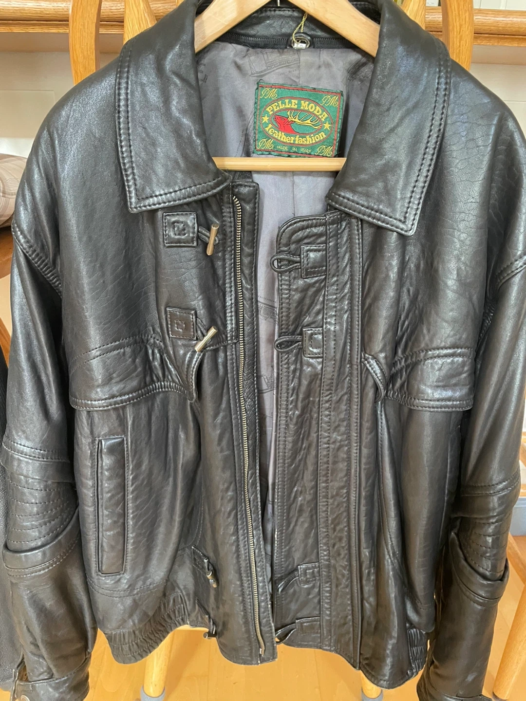 A Pelle Moda leather jacket made in Italy. Classic design with a zippered front and toggle closures. It's a stylish outerwear piece. This jacket is made of leather material.