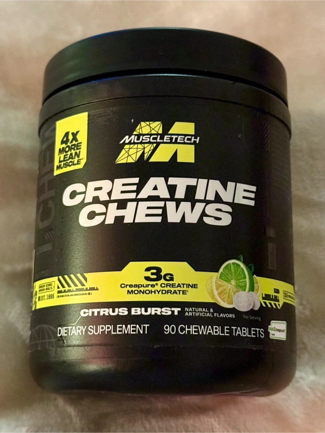 Authentic MuscleTech Creatine Chews, brand new sealed container. citrus Burst flavour. These chews are the perfect addition to you supplement stack. Each serving (3 chewable tablets) provides 3g of Creapure creatine monohydrate in tasty and convenient candy-like chew!