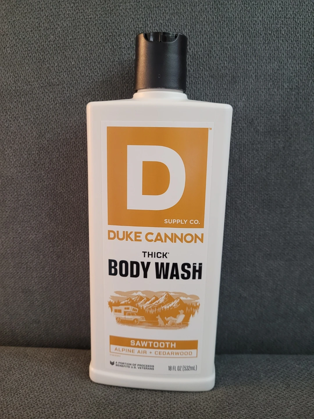 Duke Cannon's THICK Body Wash in the Sawtooth scent. It smells like a pleasant mountain airstream, not a parking garage. Formulated with a significantly higher viscosity to work more effectively on your body. Mineral-enriched to exfoliate.