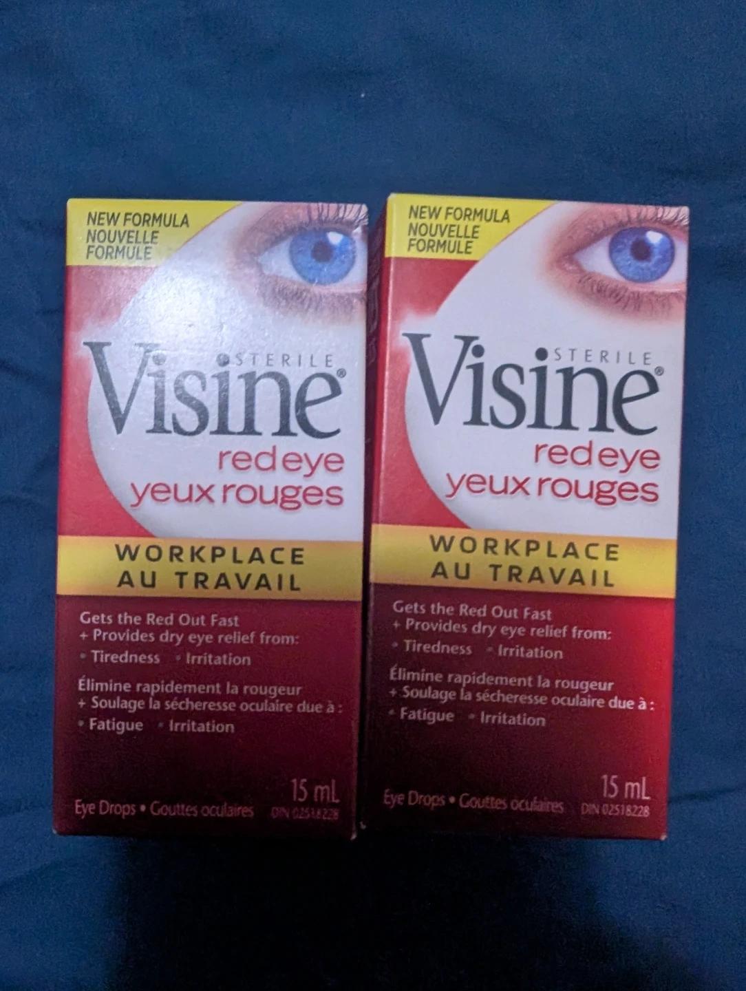 Selling two boxes of Visine Redeye eye drops. These eye drops get the red out fast and provide dry eye relief from tiredness and irritation. Each bottle contains 15 mL of eye drops.