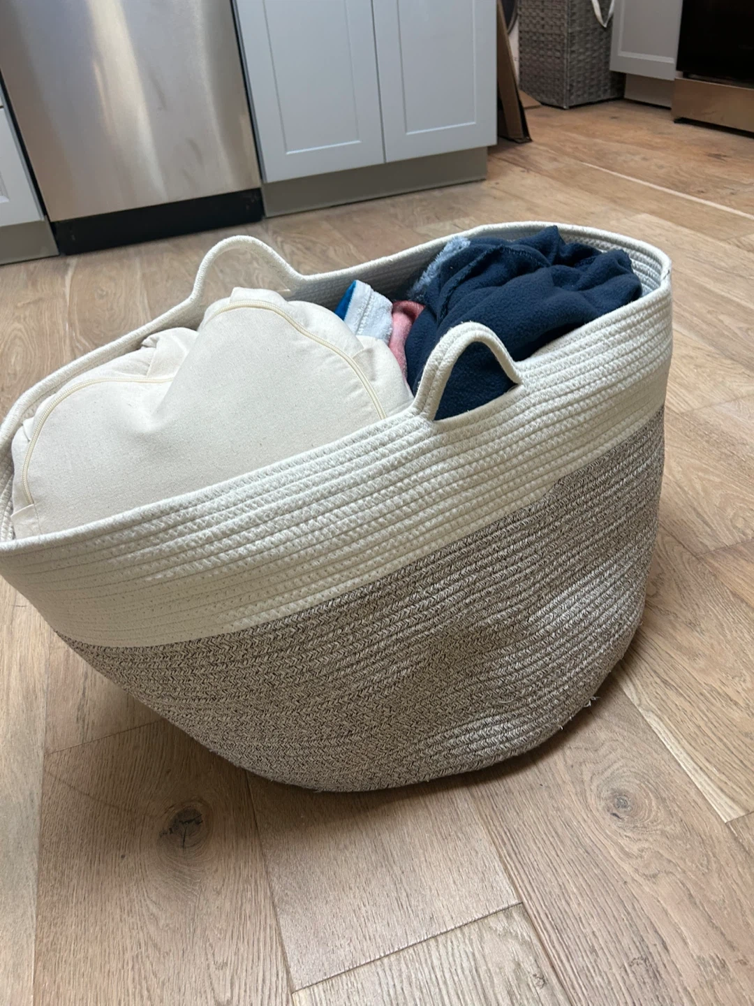 Selling a large woven rope basket in neutral colors. It's in great condition and perfect for storage or decor! The basket is sturdy and has a nice, clean look. It would be great for organizing blankets, toys, or laundry. Stuff inside not included…just used it to show its shape when full.